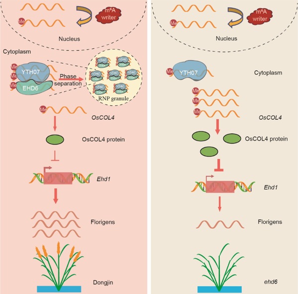 《Molecular Plant》发表万建民院士团队“The RNA binding protein EHD6 recruits the m6A reader YTH07 and sequesters OsCOL4mRNA into phase-separated ribonucleoprotein condensates to promote rice flowering”