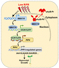 在遮荫条件下,喜阳植物与周围植物竞争阳光会产生避荫综合症(SAS)。红光受体phytochrome B (phyB)在感知遮荫信号和触发SAS中起主导作用。遮荫信号使有生物学活性的phyB-Pfr形式转变为无活性的phyB-Pr形式,从而使得植物生长促进因子PHYTOCHROME INTERACTING FACTOR 4(PIF4)积累以促进植物生长。