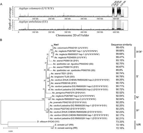 来源分析发现,Ym1仅在山羊草属部分物种中存在同源基因(89.2%-99.6%),例如高大山羊草(Ae. longissima)、西尔斯山羊草(Ae. searsii)等。其中Ym1与小亚山羊草(Ae. columaris, UcUcXcXc)和三芒山羊草(Ae. neglecta, UnUnXnXn或UnUnXnXnNnNn)的Ym1同源基因(分别来自Xc或Xn亚基因组)序列相似性大于99.4%,推测Ym1可能通过多倍体山羊草属物种与普通小麦杂交渐渗进入栽培小麦。