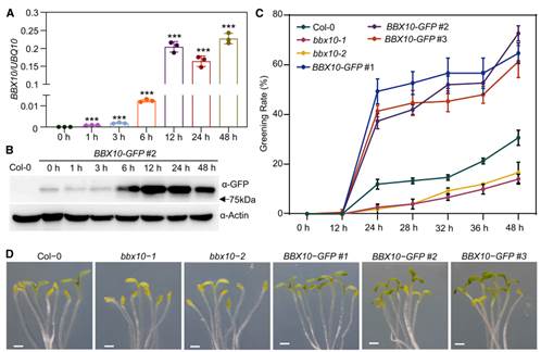 本研究发现转录因子B-box蛋白10(BBX10)通过抑制黑暗环境中原叶绿素酸酯的生物合成以及光照下活性氧(ROS)的积累,显著提高去黄化过程中幼苗的绿化率与存活率。BBX10与光敏色素互作因子1(PIF1)相互作用,增强PIF1对靶基因GENOMES UNCOUPLED 5(GUN5)和抗坏血酸过氧化物酶2(APX2)启动子的DNA结合亲和力,并分别调控其对GUN5的转录抑制活性和对APX2的转录激活活性。遗传学分析表明,在绿化调控通路中,BBX10处于PIF1、GUN5和APX2的上游促进子叶去黄化。本研究揭示了BBX10-PIF1转录调控模块通过抑制黑暗中原叶绿素酸酯的生物合成与光照下ROS的积累,保护破土幼苗免受光氧化损伤的分子机制。