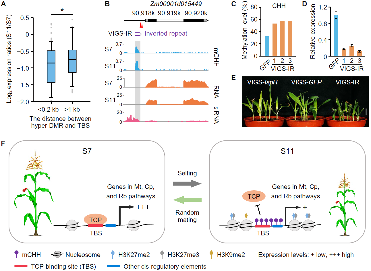 该研究通过比较玉米不同世代自交群体在第7-第11代(S7-S11)之间,以及自交群体S11与随机交配群体M11之间的生长势和DNA甲基化变化,发现自交衰退过程中伴随着基因上下游CHH甲基化的升高(图1)。而自交引起的DNA甲基化增加的区域富集Teosinte branched 1/Cycloidea/Proliferating(TCP)结合位点TBS和调控染色可及性的元件。相应的,自交衰退过程中这些DNA甲基化升高的区域表现出染色质可及性的降低,以及两个抑制性组蛋白修饰H3K27me2和H3K27me3水平的增加。TCP调控的线粒体、叶绿体和核糖体功能相关基因在DNA甲基化增加的基因中显著富集,并且这些基因的表达随着DNA甲基化升高而降低。有趣的是,随机杂交能够逆转这些自交诱导的高甲基化和TCP调控基因表达的下降,从而恢复生长势。随后,作者利用凝胶阻滞分析(EMSA)、DNA亲和纯化定量(DAP-qPCR)以及基于CMV-VIGS载体的病毒侵染实验,证明了玉米自交诱导的启动子区域的高甲基化会影响ZmTCP蛋白的结合,影响其下游基因的表达,从而表现出生长势的降低(图2)。