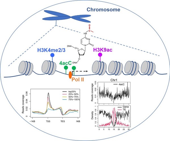 该研究分别在拟南芥和玉米中绘制了4acC修饰图谱,发现4acC修饰主要分布于拟南芥常染色质区域,在蛋白编码基因的转录起始位点(TSS)附近丰度最高,其修饰丰度与基因转录表达水平呈显著正相关。此外,相关性分析表明4acC与活性组蛋白标记(如H3K4me2/3、H3K36me3、H3K9ac等)显著共定位,但与5mC分布相互独立,它们交互作用共同参与基因转录表达调控。