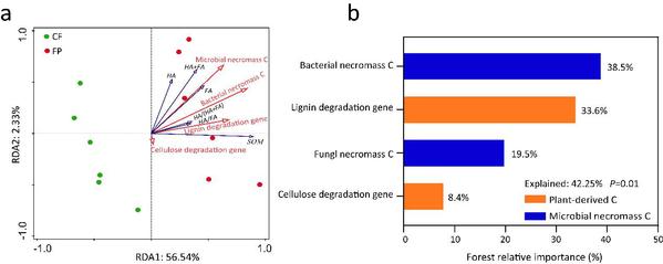 图1-5.RDA显示了参与木质素和纤维素降解的不同微生物(a)和微生物残体与土壤化学性质间的关系(b)