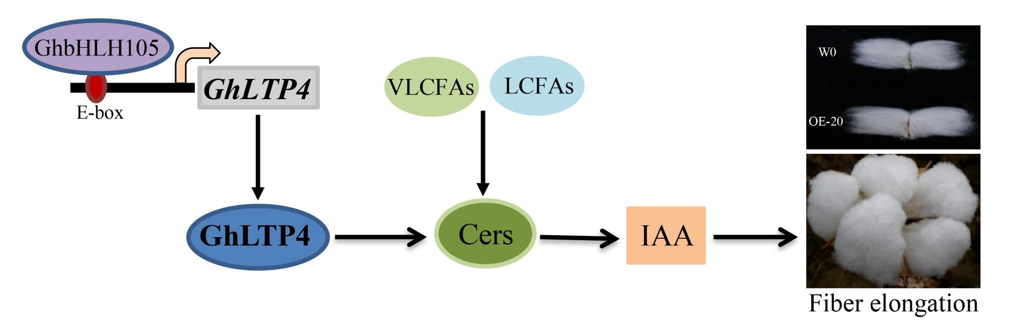 该研究团队鉴定到一个在棉纤维中特异表达的脂质转运蛋白GhLTP4,亚细胞定位表明GhLTP4蛋白定位于细胞膜。进一步创制了GhLTP4过量表达及抑制表达转基因棉花材料并进行表型鉴定,发现GhLTP4过量表达和抑制表达分别导致棉纤维长度的显著增加和减少。转录组分析表明,生长素IAA含量和生长素应答途径在GhLTP4转基因株系中显著改变。脂质组学和蛋白质-脂质结合实验表明,GhLTP4与Cers的结合活性最强。体外实验表明Cers作用于生长素的上游调控棉纤维伸长。研究进一步对GhLTP4的上游调控因子进行了挖掘,发现转录因子GhbHLH105通过直接与GhLTP4启动子上的E-box 元件结合,正向调控GhLTP4的表达。综上研究表明,棉纤维中特异表达的GhLTP4,其表达受 GhbHLH105正调控。 GhLTP4主要转运Cers并激活生长素IAA介导的纤维细胞伸长。