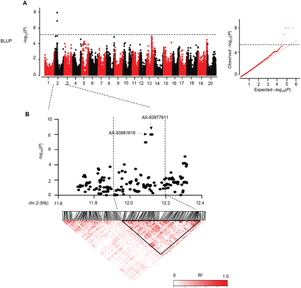 本研究利用219份大豆材料组成的自然群体进行全基因组关联分析(图1),发掘了一个位于大豆2号染色体上的大豆对SMV抗性新基因,GmMLRK1。该基因主要在大豆叶片表达,在大豆抗SMV材料中显著受到大豆SMV株系SC7诱导,其受诱导时间早于大豆感病材料,且受诱导强度也高于大豆感病材料。