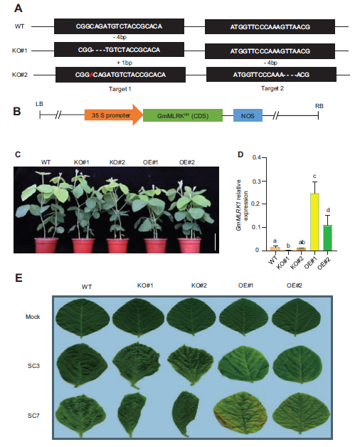 进一步构建GmMLRK1基因的过表达及敲除载体转化大豆,获得过表达该基因及敲除该基因的材料。通过接种鉴定发现,过表达该基因可以提高大豆对SMV抗性(图2)。