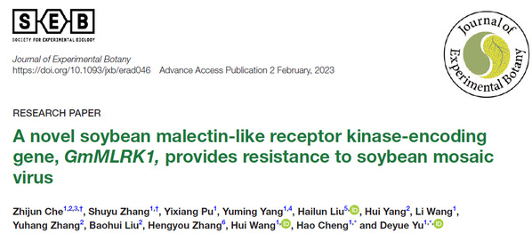 《Journal of Experimental Botany》发表国家大豆改良中心喻德跃教授课题组“A novel soybean malectin-like receptor kinase-encoding gene, GmMLRK1, provides resistance to soybean mosaic virus”