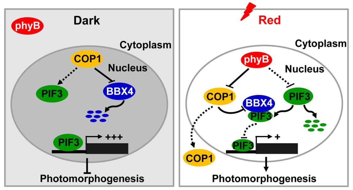 在植物中不同的光受体特异性地识别太阳光中不同波长的光信号而调控生长发育。其中植物红光受体光敏色素B(phyB) 吸收红光信号调控植物的诸多生长发育过程如种子萌发、幼苗形态建成、开花、成株分蘖等。本研究鉴定了一个直接作用于phyB信号下游的一个重要组分B-BOX CONTAINING PROTEIN 4(BBX4)。在黑暗下,BBX4 被E3泛素化连接酶COP1 降解。在红光信号下,phyB直接与BBX4在细胞核内相互作用,并促进BBX4的蛋白稳定。积累的BBX4直接与红光信号的一个负调控子PIF3相互作用而抑制了PIF3的转录调控活性。由此,phyB-BBX4-PIF3调控模块控制了植物在红光信号下的形态建成。