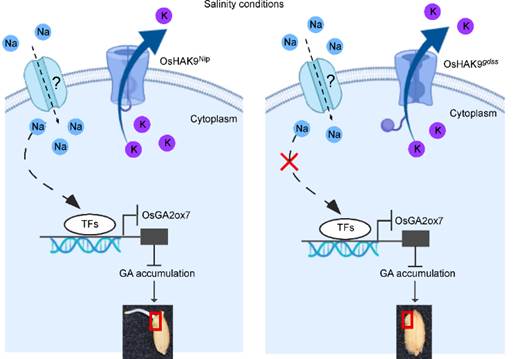 该研究利用EMS化学诱变方法,筛选获得一个盐胁迫下种子萌发缺陷突变体gdss,利用MutMap定位克隆技术,结合候选基因敲除突变体和回补转基因材料,明确GDSS候选基因是编码钾离子转运蛋白OsHAK9。研究表明:盐胁迫下水稻种子萌发时,OsHAK9通过抑制K+外排、促进Na+积累,诱导相关转录因子抑制GA代谢基因OsGA2ox7的表达,增加萌发种子中GA的含量,提高盐胁迫下种子萌发能力。该研究首次揭示了HAKs通过GA调控水稻种子耐盐萌发的分子机制,为培育适合盐碱地区高活力种子水稻品种提供重要基因资源。