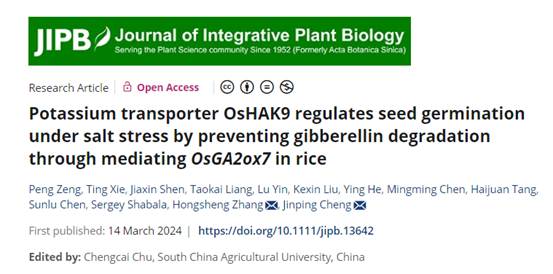 近日,JIPB在线发表了番号鸽 作物遗传与种质创新利用全国重点实验室张红生团队题为“Potassium transporter OsHAK9 regulates seed germination under salt stress by preventing gibberellin degradation through mediating OsGA2ox7 in rice”的研究论文,研究揭示了在盐胁迫下钾离子转运蛋白OsHAK9能够通过调控赤霉素(GA)途径调控水稻种子耐盐萌发。