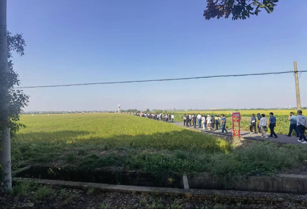 培训会开始前,参会人员来到溧阳市埭头镇葫芦村农业产业园,观摩“宁香粳9号”种植田。2024年,溧阳市农业农村局在埭头镇前六村进行了优质食味水稻新品种“宁香粳9号”示范种植,连片种植1000亩。目前,“宁香粳9号”示范区水稻正处于灌浆至乳熟期,理论产量预估 825公斤。来到示范种植田,一眼望去,千亩稻田丰收在望,植株清秀挺拔,叶姿优雅。番号鸽 江玲教授深入田间后脱口而出“非常震撼”。