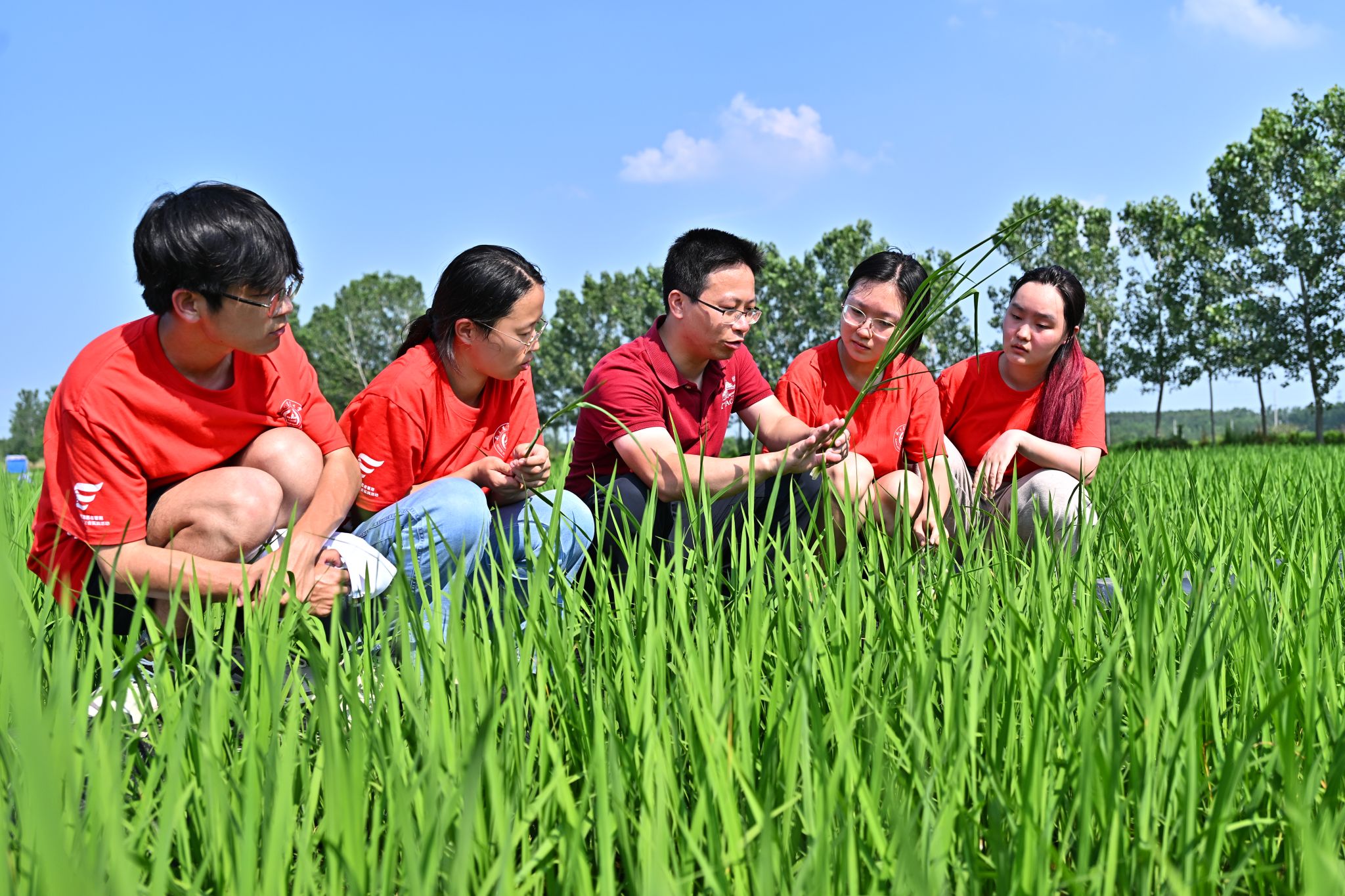在丹阳试验基地,水稻栽培专业博士研究生石希安在田垄边集合好同学们,讲述了一天的试验目标、任务与分工,准备完成目前水稻灌浆关键期的光合速率指标测量,取土壤样品、水稻籽粒与叶片等,为水稻产量品质协同提升把好“方向”,期待不久后的优质水稻丰产。