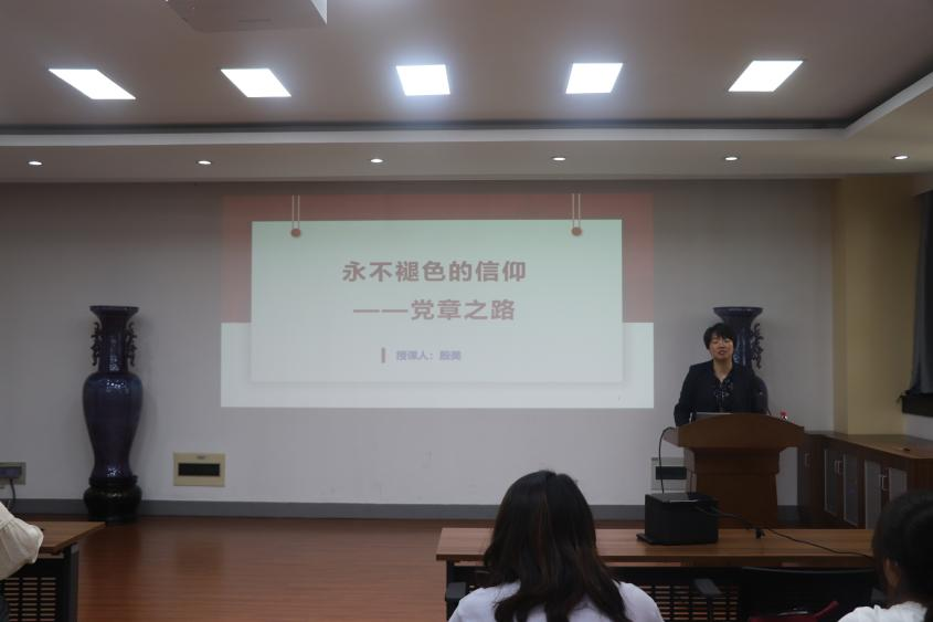 殷美通过党章概述和党章之路两部分,深入讲解了党章的重要地位与发展历史。殷美表示,从党的一大到党的二十大,党章是与时俱进的,随着时代的发展不断被赋予新的内涵,注入新的能量,同学们要认真学习党章、严格遵守党章,树立正确党史观。