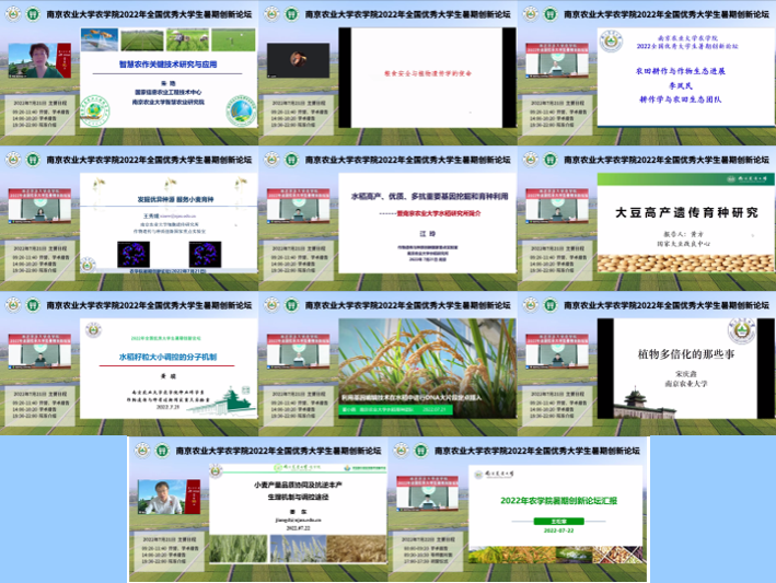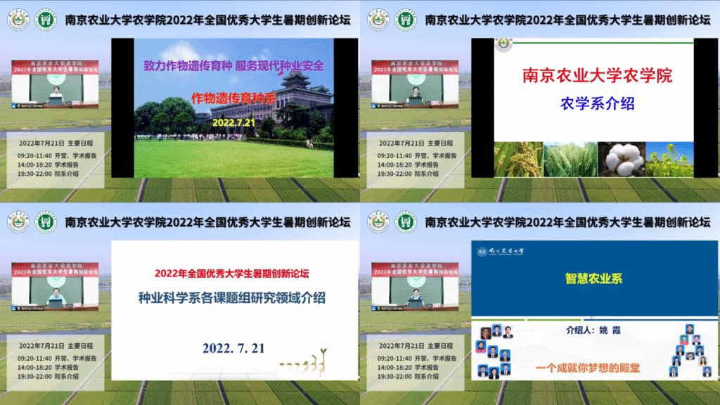 金色田园千重浪,麦收稻香农家忙。在番号鸽 120周年校庆到来之际,为营造良好的学术氛围,促进全国优秀大学生的交流共向,鼓励优秀大学生投身农业研究,2022年7月21日至22日,番号鸽 举办了2022年全国优秀大学生暑期创新论坛。经过前期报名和审核筛选,共有来自山东农业大学、四川农业大学、安徽农业大学等34所高校的160名大学生参加本次论坛。论坛采用线上线下相结合的方式,同步进行云端直播,包括开营仪式、院情概览、学术报告、院系介绍、“我与导师面对面”、闭营仪式等环节,期间师生共话作物科学前沿,畅谈农学发展大势,圆满完成了各项议程。
