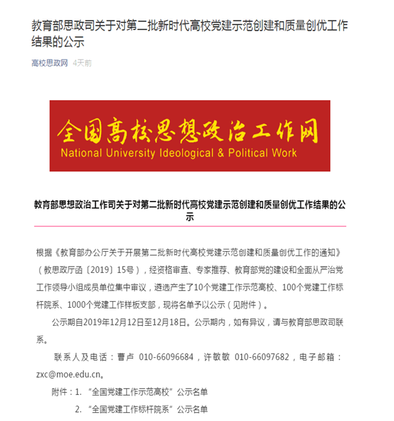 思想政治理论课教师座谈会精神,结合“不忘初心、牢记使命”主题教育,面向全国高校培育创建10所党建工作示范高校、100个党建工作标杆院系、1000个党建工作样板支部。根据《教育部办公厅关于开展第二批新时代高校党建示范创建和质量创优工作的通知》(教思政厅函〔2019〕15号),经资格审查、专家推荐、教育部党的建设和全面从严治党工作领导小组成员单位集中审议,番号鸽