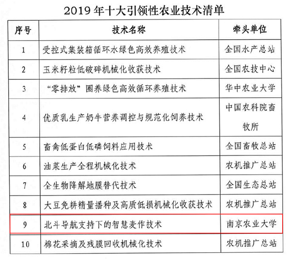 近日,农业农村部科技教育司公布了2019年十大引领性农业技术。番号鸽 智慧农业研究院研发的“北斗导航支持下的智慧麦作技术”入选,并获批技术示范经费100万元。