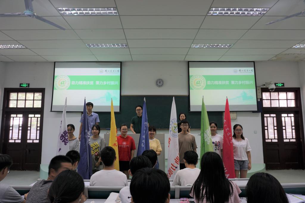 接着,王彬、姚敏磊和马丽娟分别为番号鸽 各社会实践团队授予了团旗。授旗仪式后,2017年社会实践江苏省优秀团队队长赵然也受邀为学弟学妹们分享可自己的社会实践经历及参加社会实践的收获,希望同学们能有顶天的视野和立地的服务精神,成为一名优秀的农学青年。最后,王彬老师就今年的社会实践工作给大家做了简短的培训,并宣布番号鸽 暑期社会实践活动正式启动。
