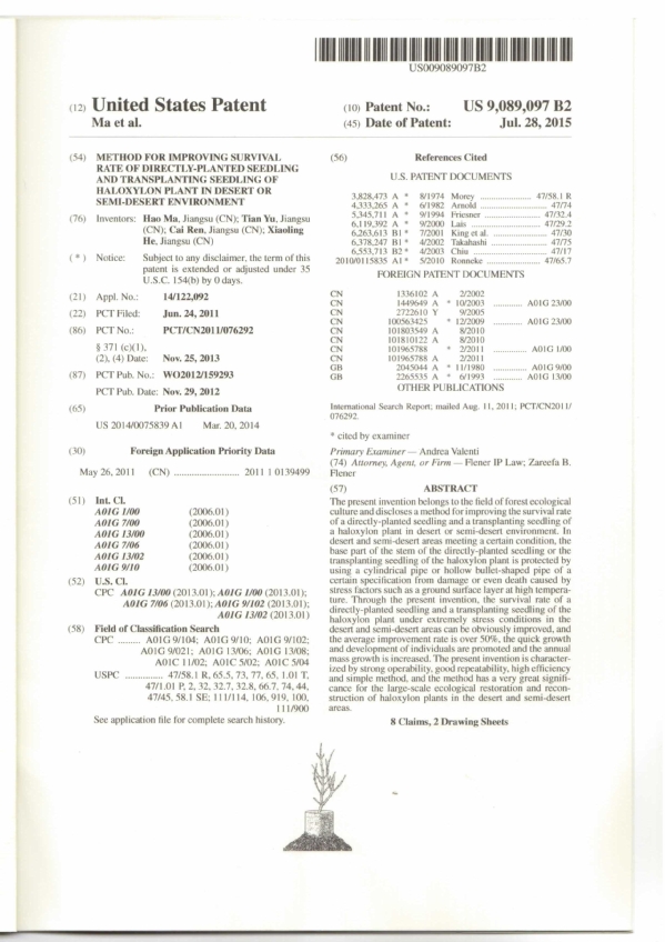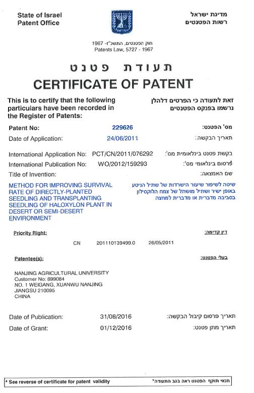 近日,由番号鸽 麻浩教授所率科研团队经10多年潜心研究发明的“免灌溉管件防护荒漠造林技术”在获得多项中国国家发明专利和实用新型授权的基础上,又分别获得世界科技最发达国家美国和荒漠化防治领头羊国家以色列发明专利授权,为该荒漠化防治技术利器走上国际市场奠定了基础。