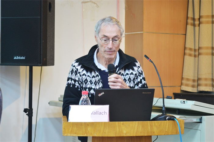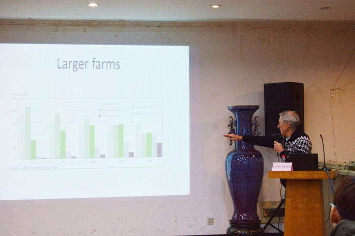 他首先为我们讲解了法国作物的种类与分布,对法国农业发展的特点做出说明,他指出机械作业、农业集约化生产和专业化生产的重要性。同时,他也表示法国农业现在也面临着旱涝灾害,温室气体大量排放,农药污染等问题。谷物产量自上世纪便处于停滞状态、谷物价格的不断下降对农业工作者来说都是严峻的挑战。而法国政府也出台了一系列政策来缓解或解决农业发展中遇到的问题。最后Wallach教授还为我们介绍了一些法国的特色,如香槟,奶酪。
