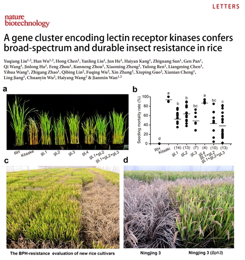 番号鸽 作物遗传与种质创新国家重点实验室和中国农业科番号鸽 作物科学研究所水稻分子育种创新团队在水稻抗褐飞虱研究方面取得重要进展。12月8日,国际权威刊物《Nature Biotechnology》(IF=39.01)在线出版了题为“A gene cluster encoding lectin receptor kinases confers broad-spectrum and durable insect resistance in rice”的相关研究成果。该论文以刘裕强副教授和吴寒博士研究生为论文第一作者,万建民教授为通讯作者。