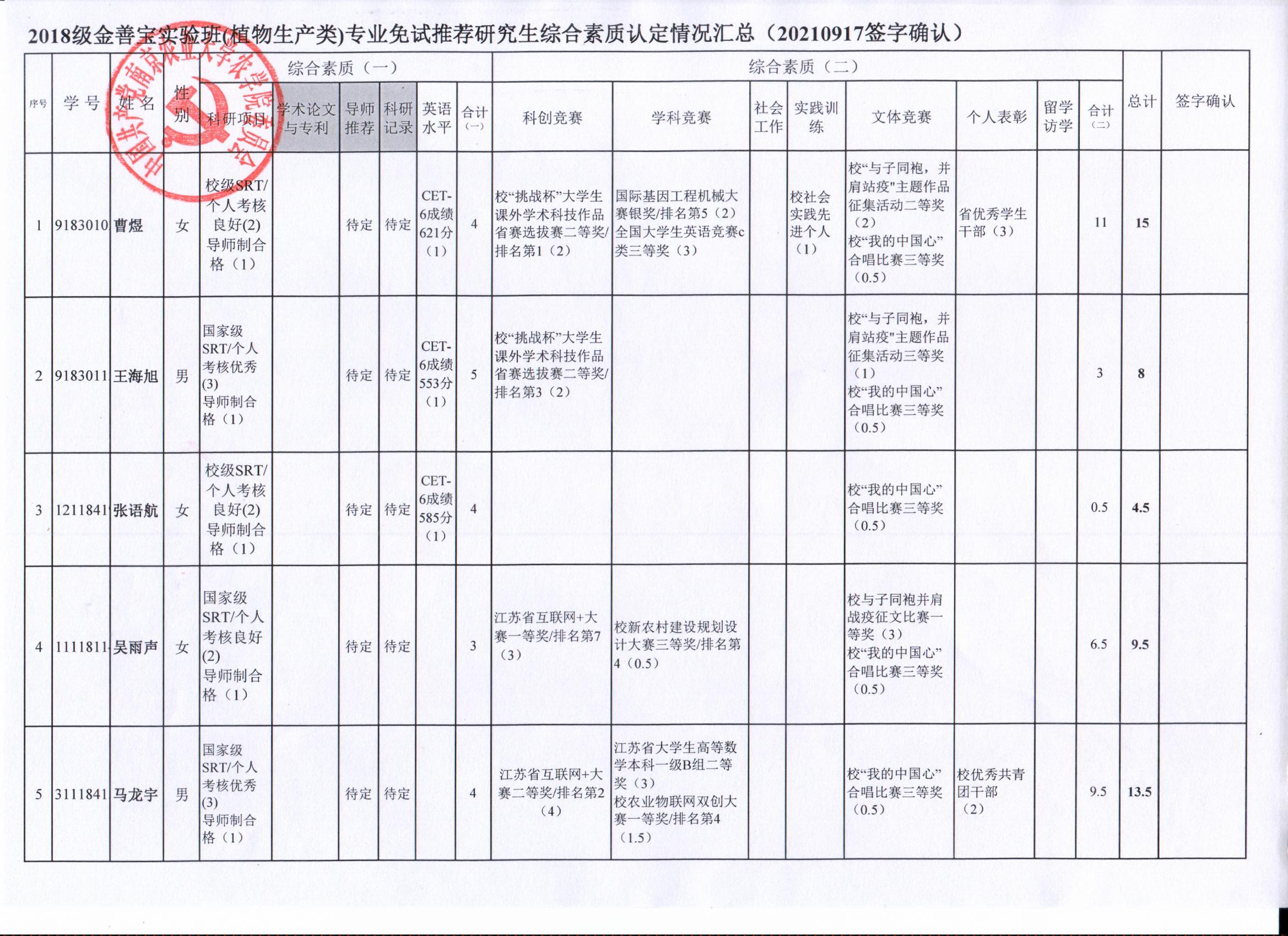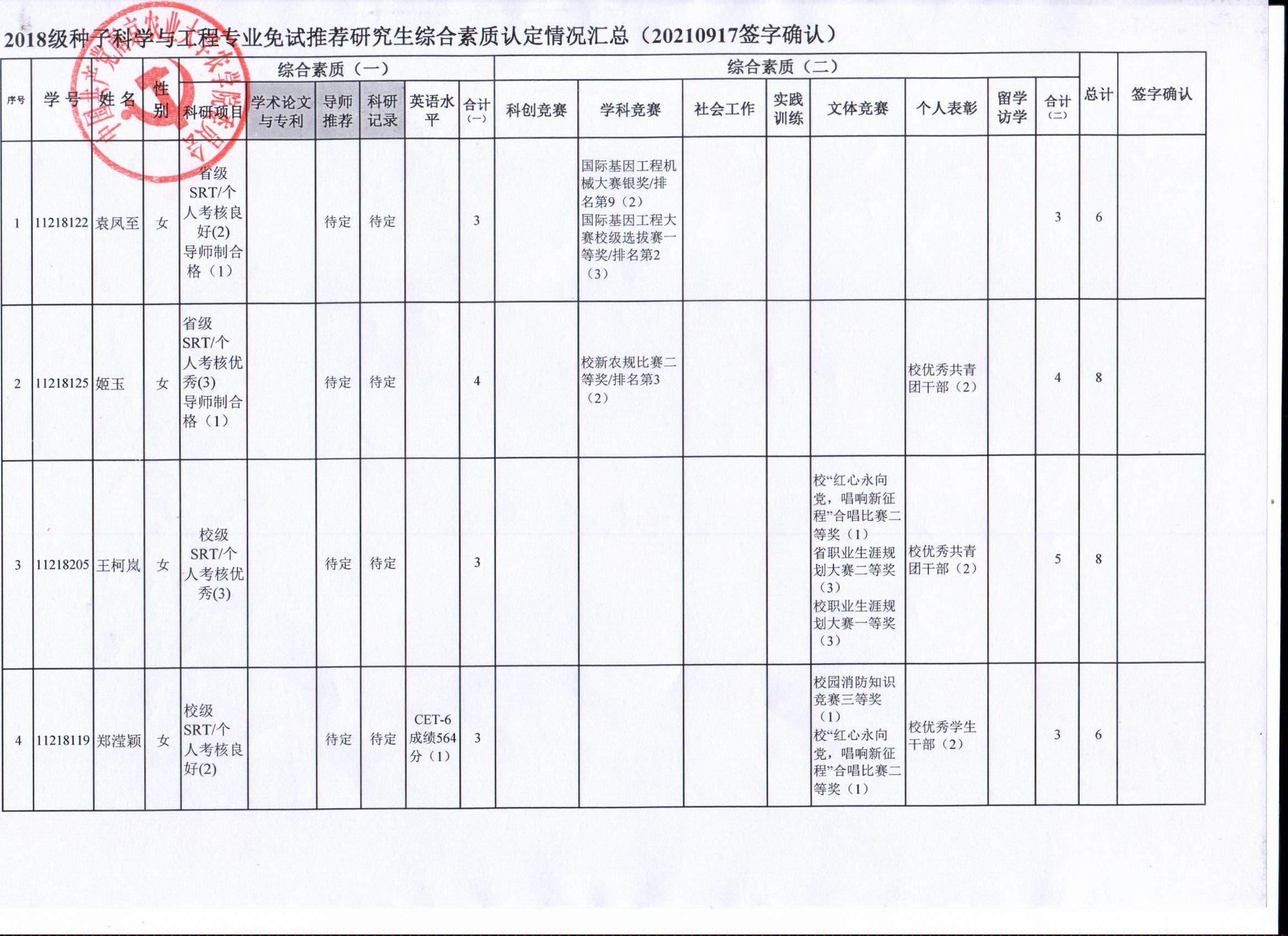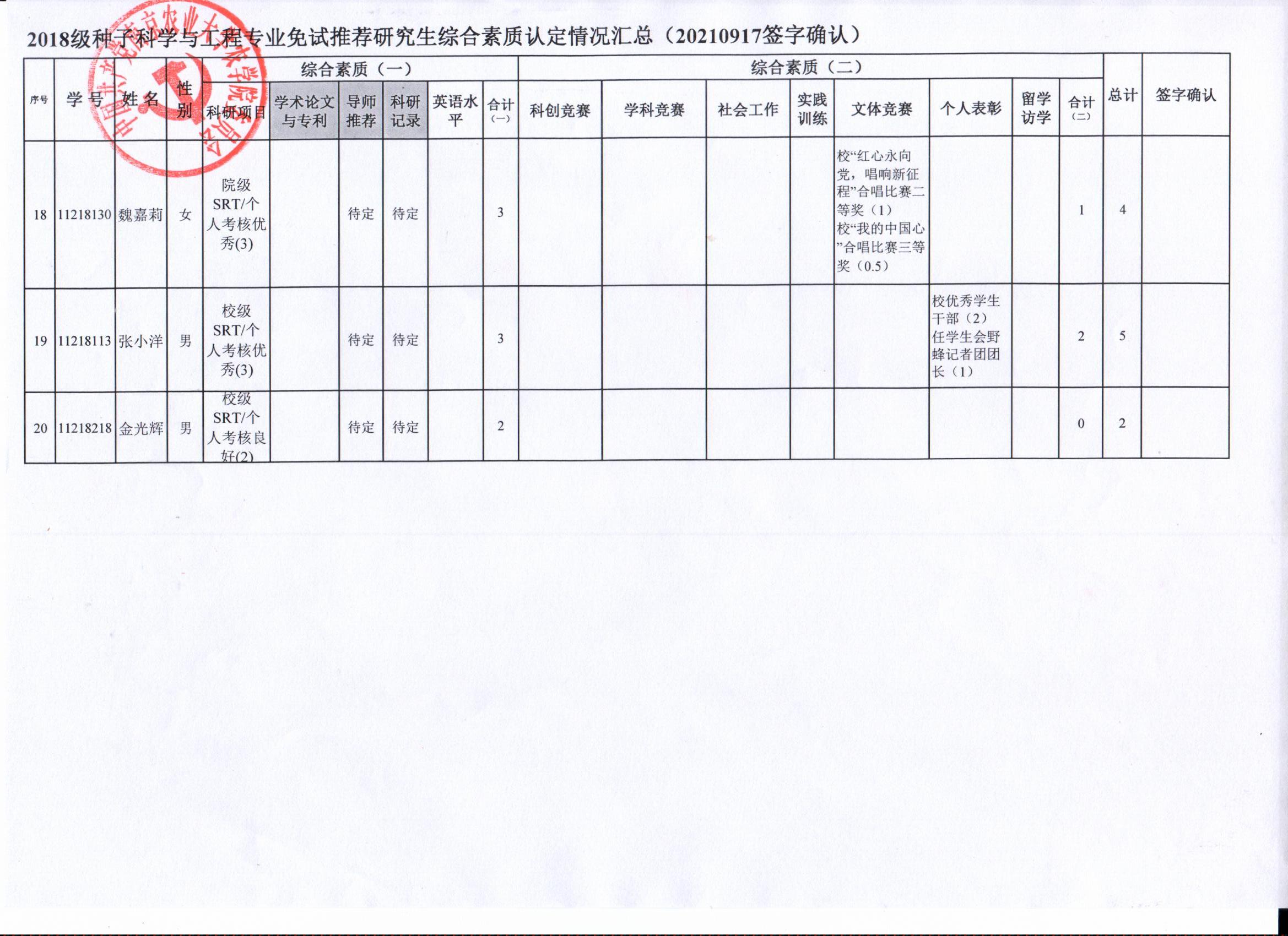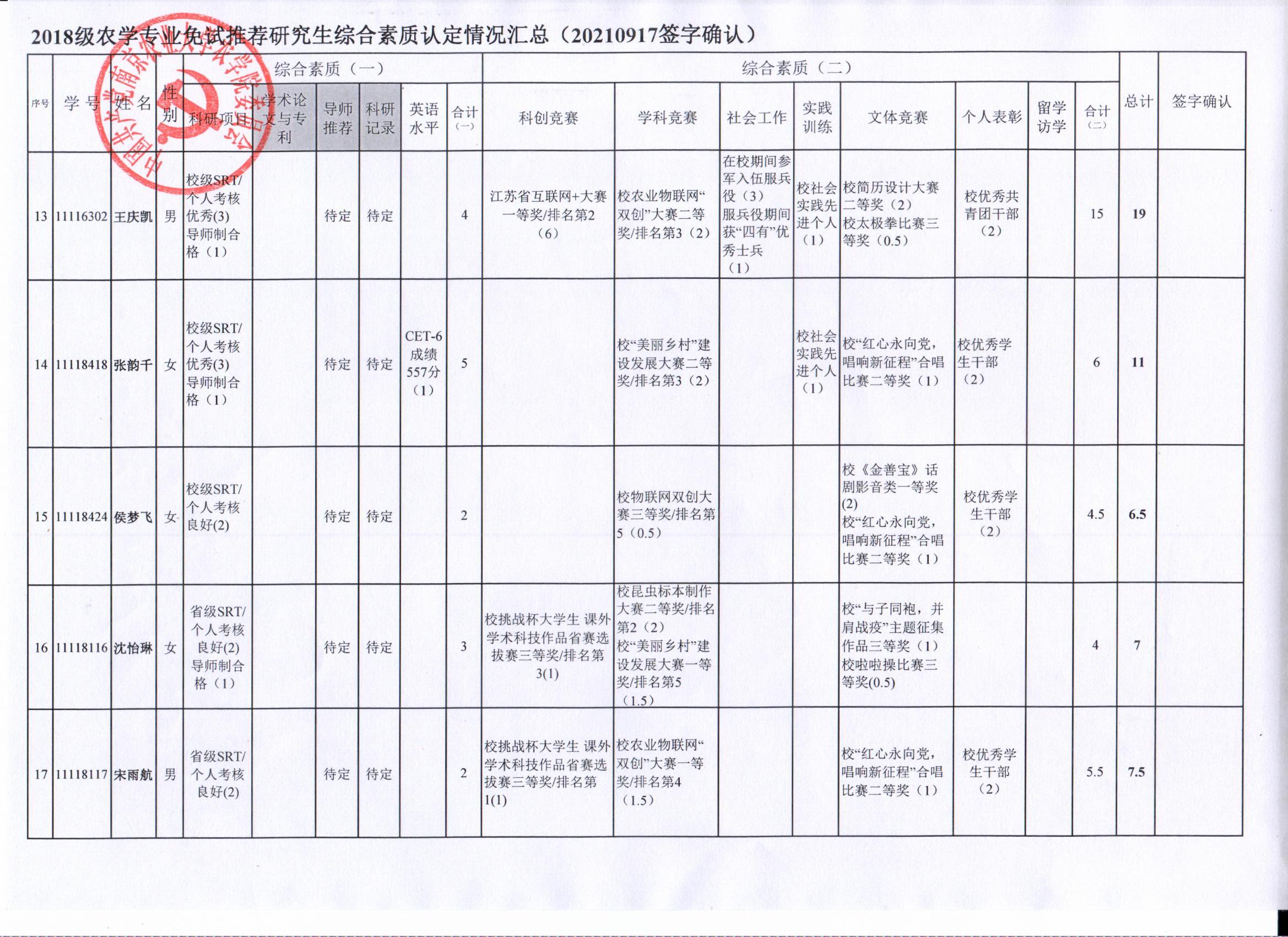 审核及学生签字确认,综合素质(一)第一、五类与综合素质(二)所有类别得分情况已于9月17-19日进行公示,现予以再次公示。