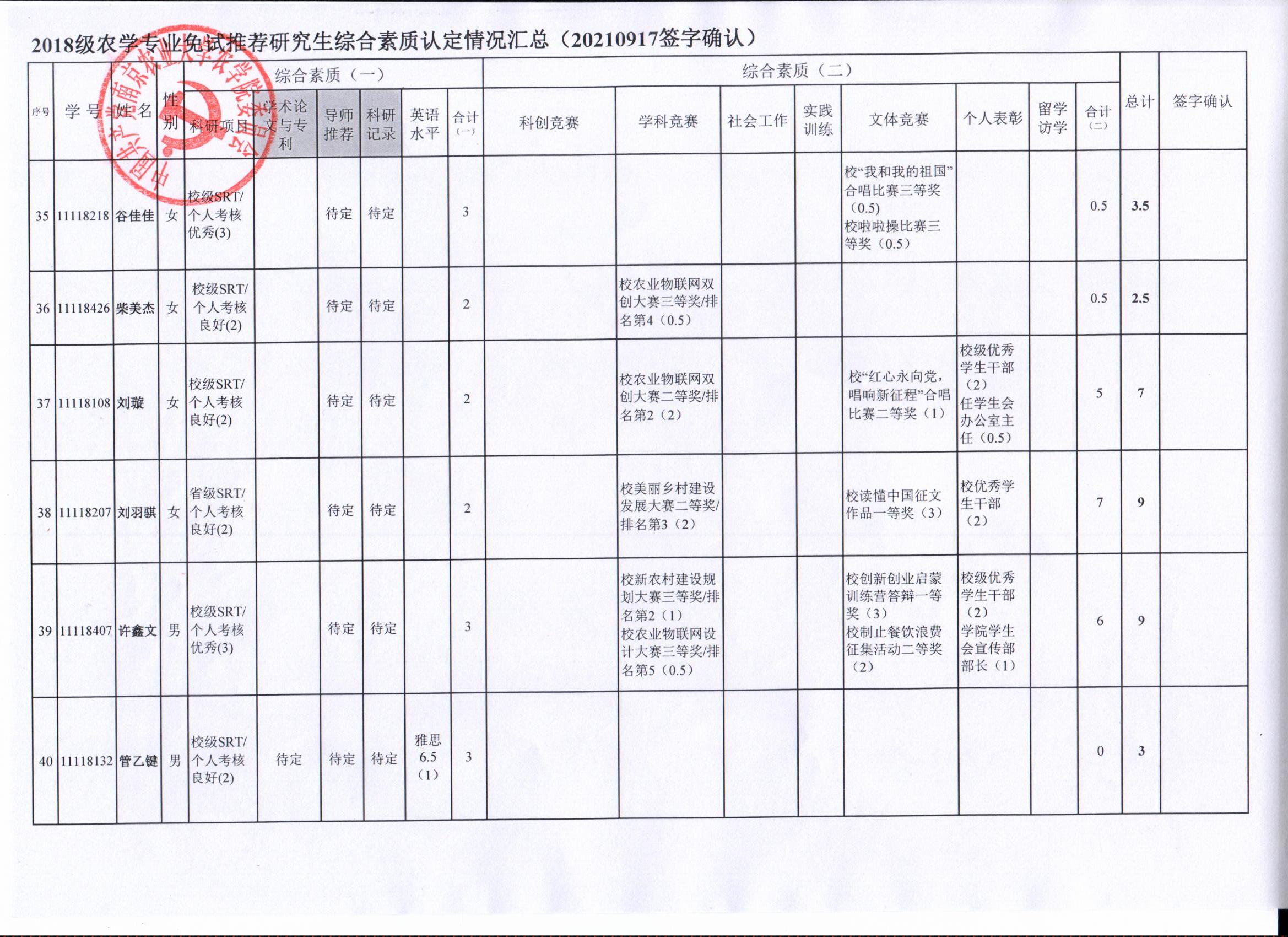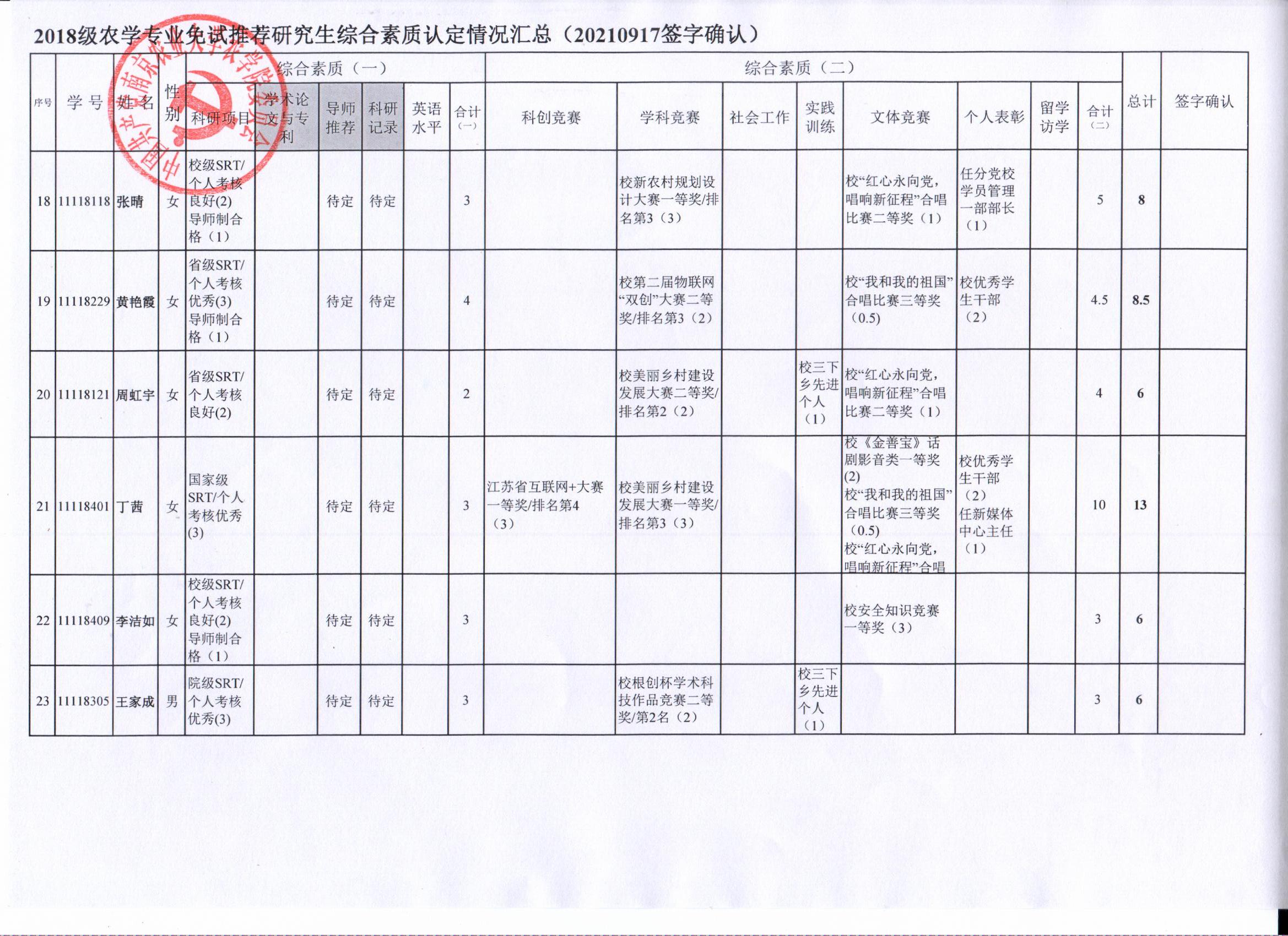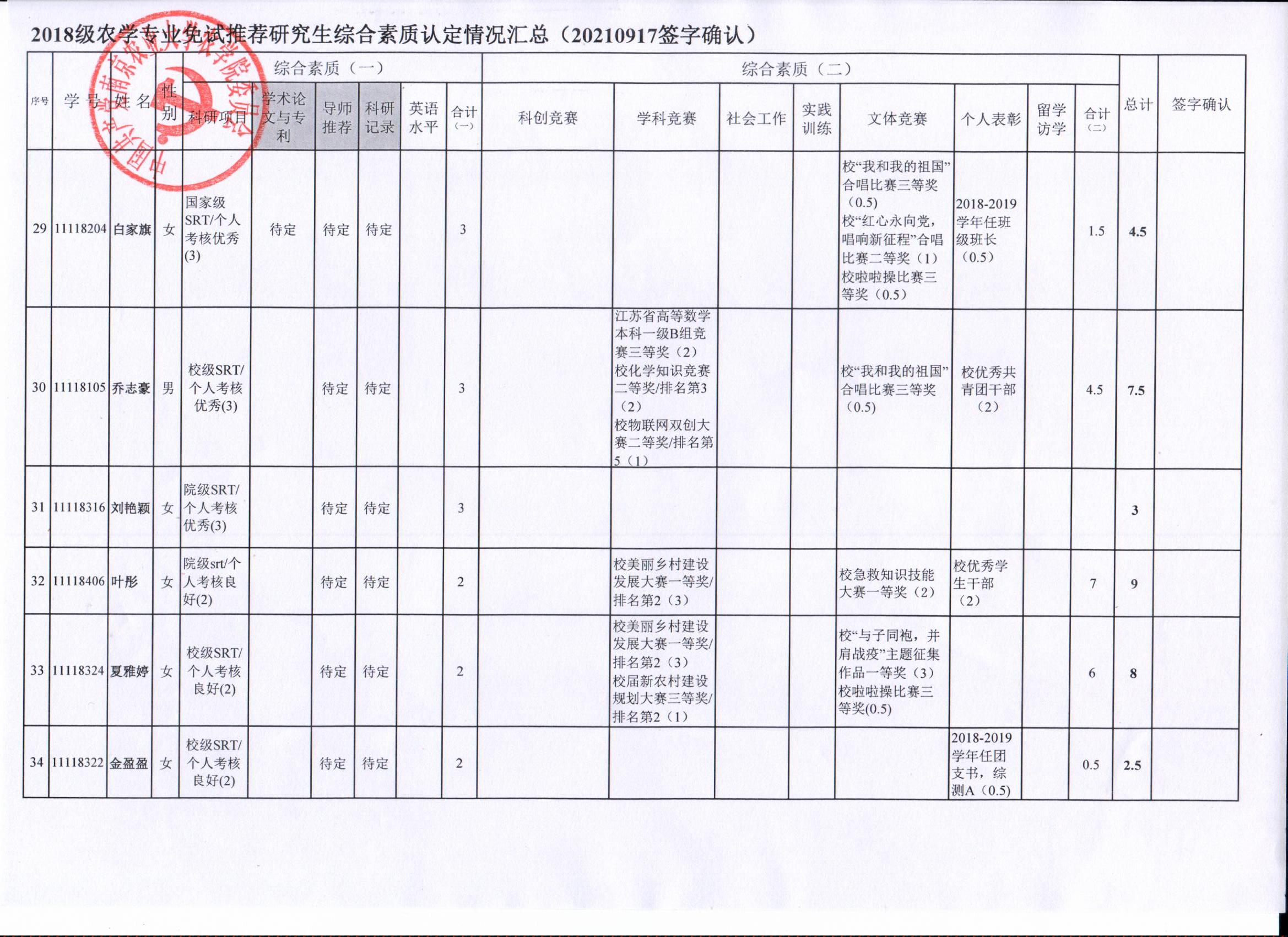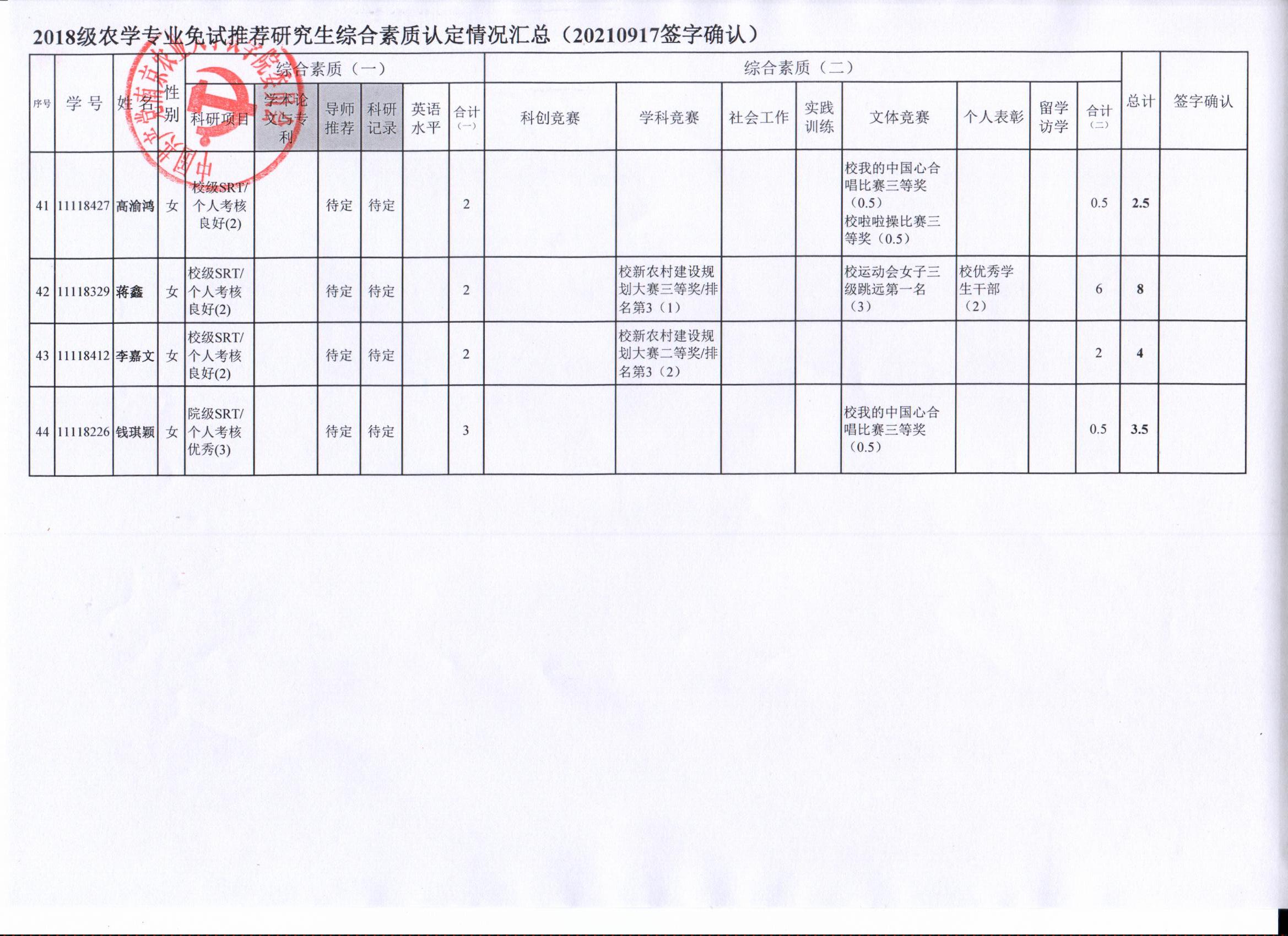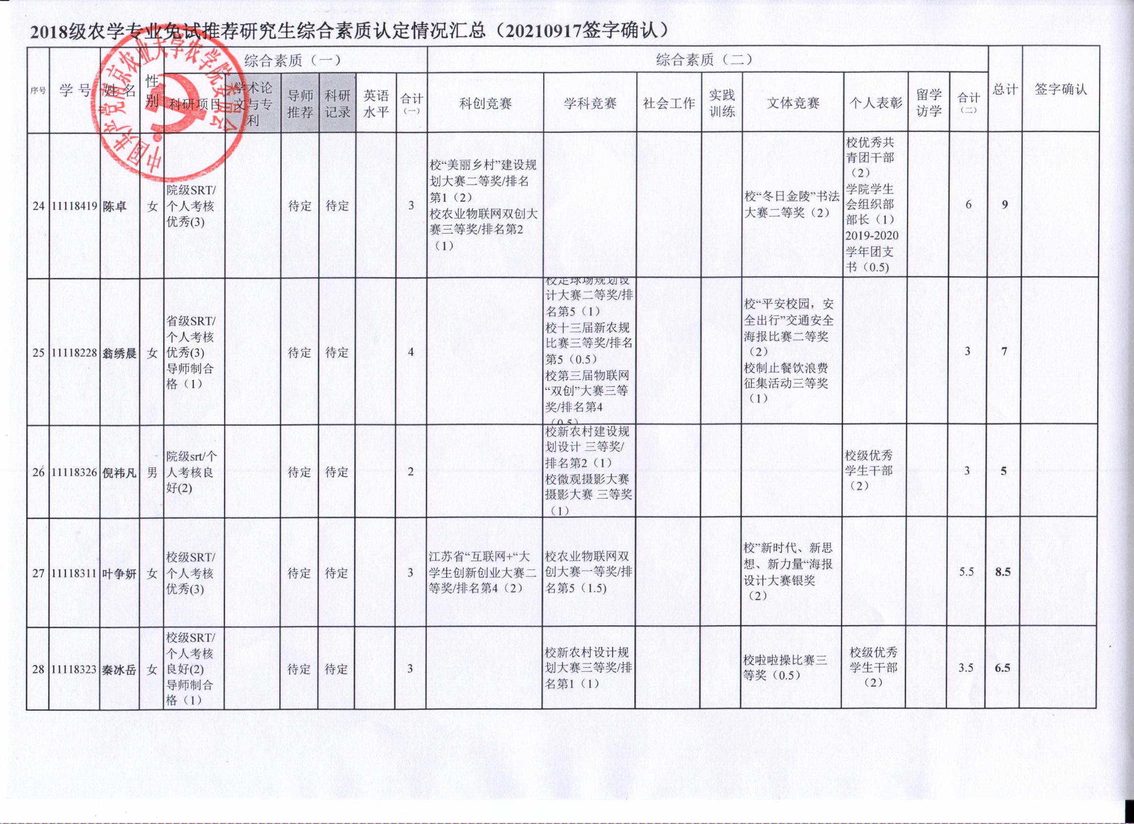 审核及学生签字确认,综合素质(一)第一、五类与综合素质(二)所有类别得分情况已于9月17-19日进行公示,现予以再次公示。