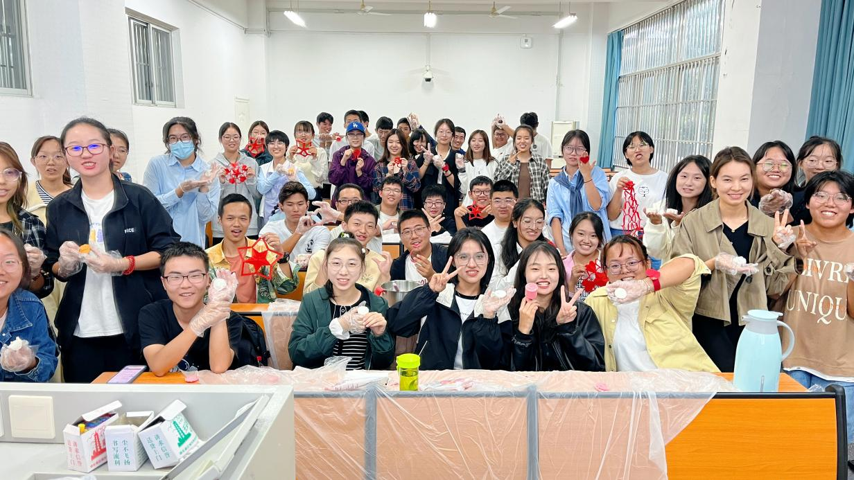 制冰皮、取馅料、揉成团、压成形……大家围在一起有说有笑,交换着馅料和模具,一个个完美的、花案和馅料各不相同的冰皮月饼在同学们手中呈现,在带班党员的带领下提前庆祝中秋节,感受浓浓中秋情。