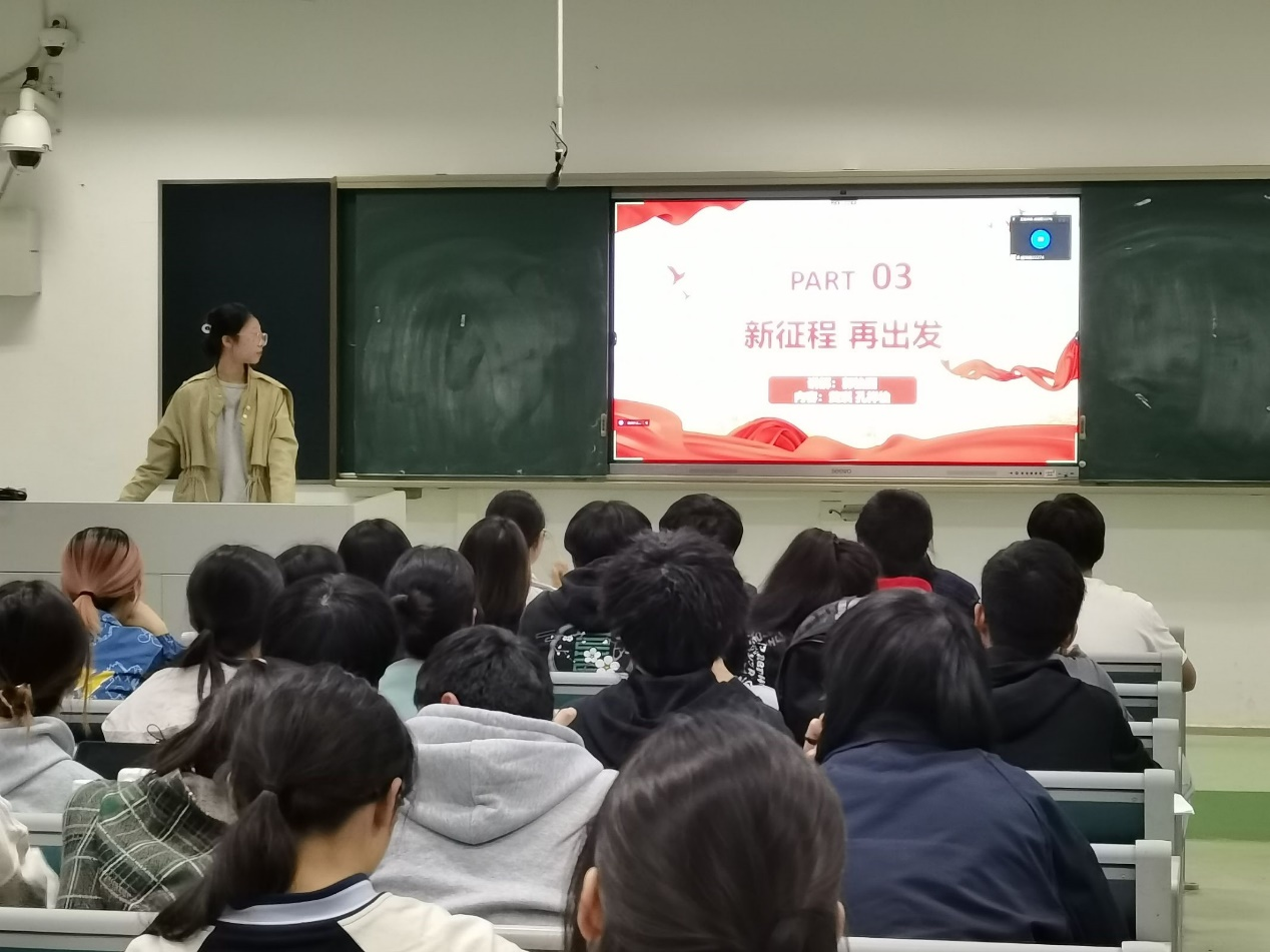 第三部分“新征程 再出发” 由郭怡囡同学带我们聚焦二十大中一些精彩环节。她为我们详细阐述了在党的二十大广西代表团讨论中强调的“五个牢牢把握”;聚焦了解农业领域的二十大代表发言,让我们收获颇多;在民生方面,牢牢把握四个亮点,分别在乡村振兴、优化教育、科技创新、就业保障等方面深入学习;同时,学习及讨论了党对青年学子的期望。
