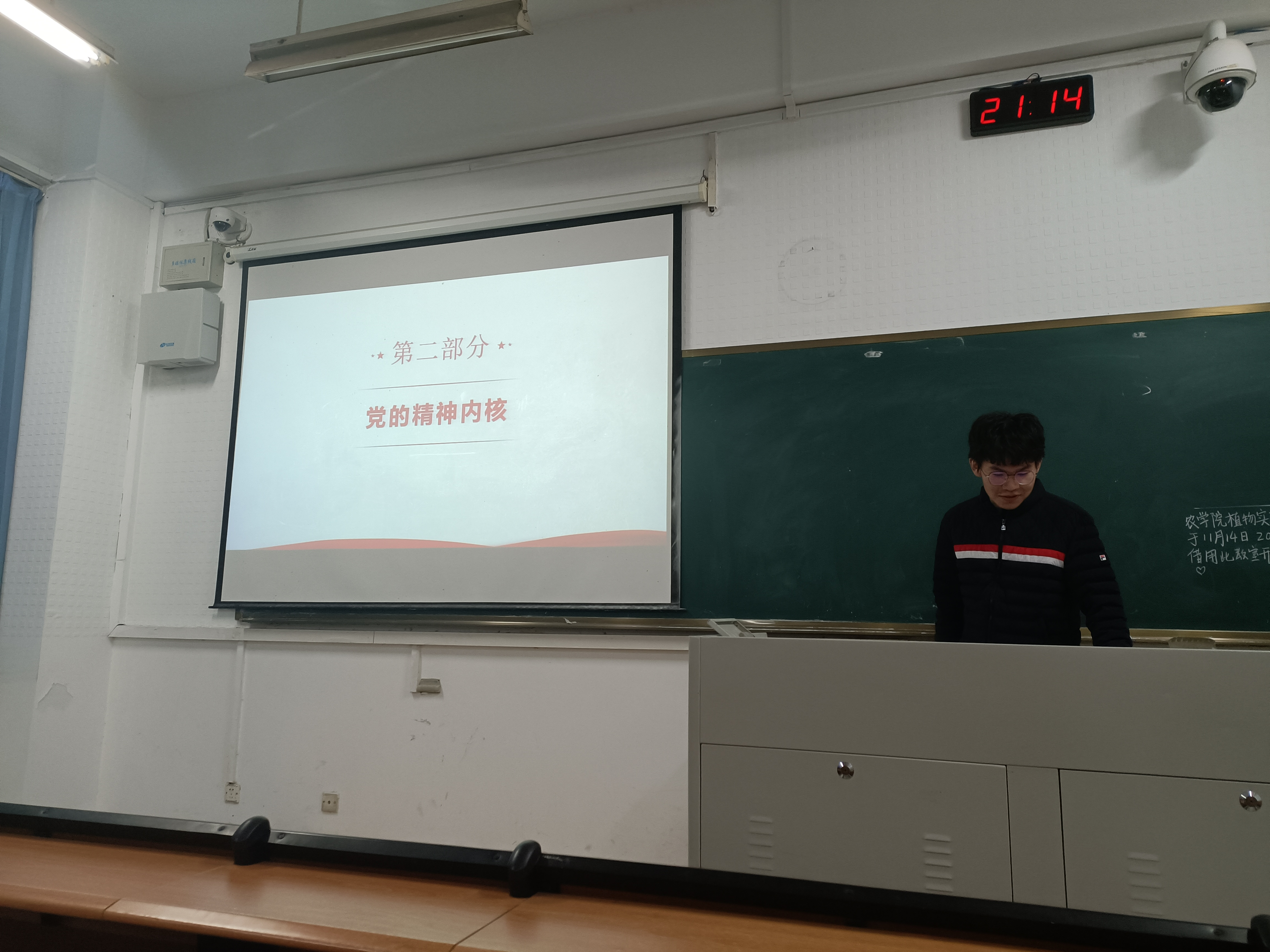 接下来,徐新阳同学重点为大家阐述了党的精神内核。徐新阳同学认为,从历史和实践的角度出发,中国共产党的伟大精神可以看作是由一个个鲜明具体的“坐标”如红船精神、井冈山精神、长征精神等组成,进而形成了一个可以长久涵养后人的“精神谱系”。他随后向大家分享了云南省丽江华坪女子高级中学党支部书记张桂梅同志的事迹,让大家进一步感受到中国共产党人一直在用实际行动履行“全心全意为人民服务”的宗旨。此外,他还介绍了党的方针中的“惠民政策”“乡村振兴”“人民当家做主”和“共同富裕”四个板块,带领大家更深入地感悟党的精神内核。
