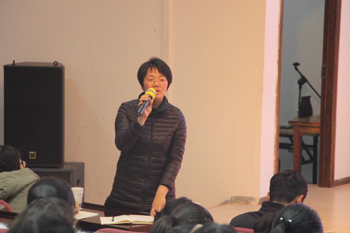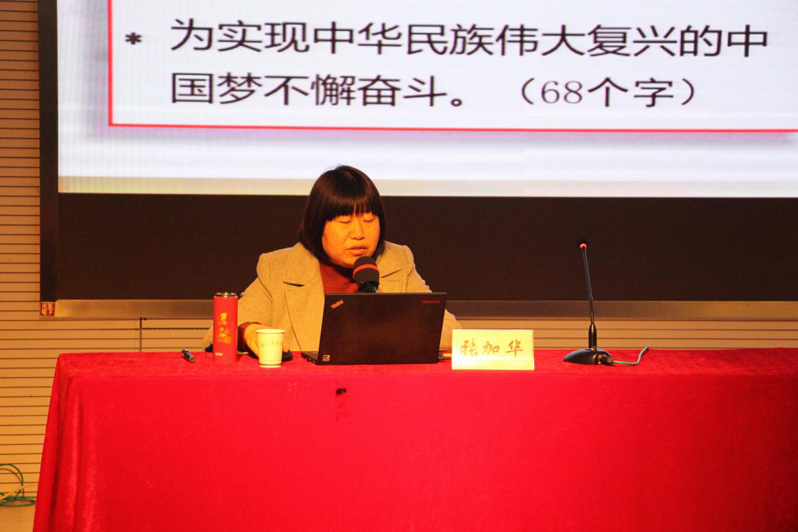 张教授首先为党建班学员解读中国共产党第十九次全国代表大会主题,指出大会主题68个字言简意赅,内涵丰富,思想深刻,高度凝练地表达了深邃的意蕴,强调使命感和责任感的重要性。她从历史,现实,未来三个角度讲述伟大复兴的中国梦。她指出中国梦是我们这一代的,更是青年一代的。中华民族的伟大复兴,绝不是轻轻松松,敲锣打鼓就能实现的。全党必须准备付出更为艰巨、更为艰苦的努力才能实现共同富裕,建立现代化强国。