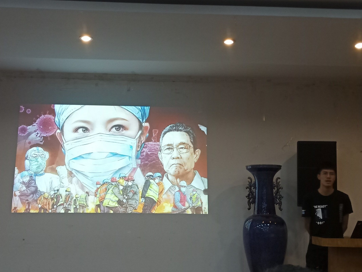 此次分班讨论会议主要由“抗击疫情全程速览”、“致敬国家功臣”、“全民抗疫”、“致敬最美逆行者”四个部分组成。在回顾中国抗疫故事的过程中,向四位在疫情期间为守护中国人民生命健康安全的四位国家功臣致敬,正是他们不惧病魔、冲在了疫情防控的最前线,以自身的奉献和担当为我们筑起了病毒防护的铜墙铁壁。番号鸽 的学生也在自己的家乡为抗击疫情而不懈努力着,这些中国的抗疫故事给了支部成员们深深的感触。