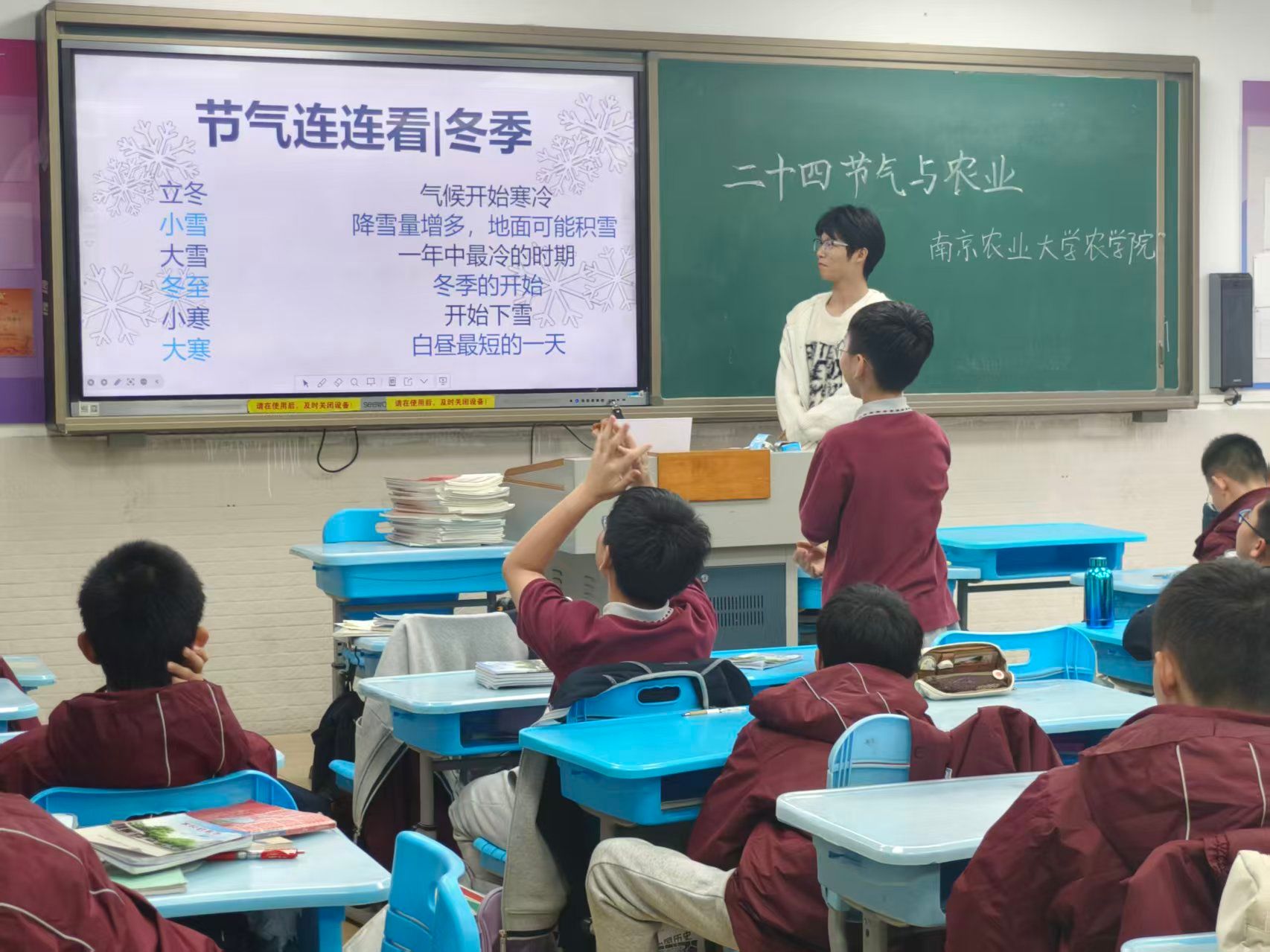 为传承中华优秀传统文化,帮助学生理解古人智慧与现代农业的关联,10月24日,一场主题为“天地节律,农耕密码——解码二十四节气”的科普课在南京理工大学附属中学精彩开讲。番号鸽 “听秾说”科普团队的志愿者们以生动的内容、鲜活的案例,带领同学们走进二十四节气的世界,感受传统智慧与现代科技的碰撞。