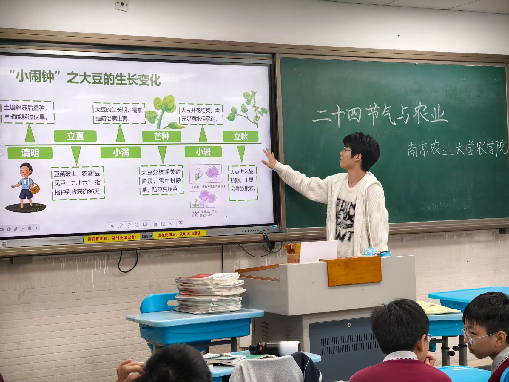 为了进一步扩展二十四节气的“闹钟”作用,主讲人表明二十四节气的“闹钟”作用在大豆生产中同样显著,“清明前后,种瓜点豆”大豆在清明时土壤解冻后播种,早播能躲过伏旱;立夏时豆苗破土,白露时大豆叶片变黄脱落,联合收割机进场;寒露时东北晚熟品种收割,豆茬地适合种冬小麦……一个个贴合实际的生长节点,让同学们直观理解古人如何通过节气把握播种、管理、收获的时机,甚至提前防范“寒露风”、“倒春寒”等灾害性天气。