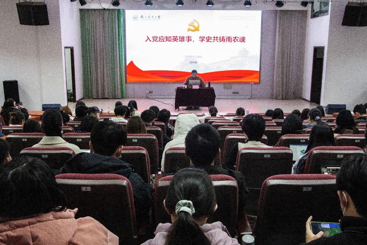最后,邵老师围绕南农人的初心与使命进行阐述,南农人在竞争压力中始终保持不认输、不服输、不抛弃、不放弃的精神与韧劲,始终怀着傲骨与傲气,牢记曾经的荣光与辉煌,扛起时代的责任与担当,找准关键环节,确保精准发力,向中国一流迈进,向世界一流出发。他鼓励南农青年要与新时代同向同行、共同前进,要爱国爱民,从党史学习中激发信仰、获得启发、汲取力量,不断坚定“四个自信”,不断增强做中国人的志气、骨气、底气,树立为祖国为人民永久奋斗、赤诚奉献的坚定理想,从而成为堪当民族复兴大任的时代新人。