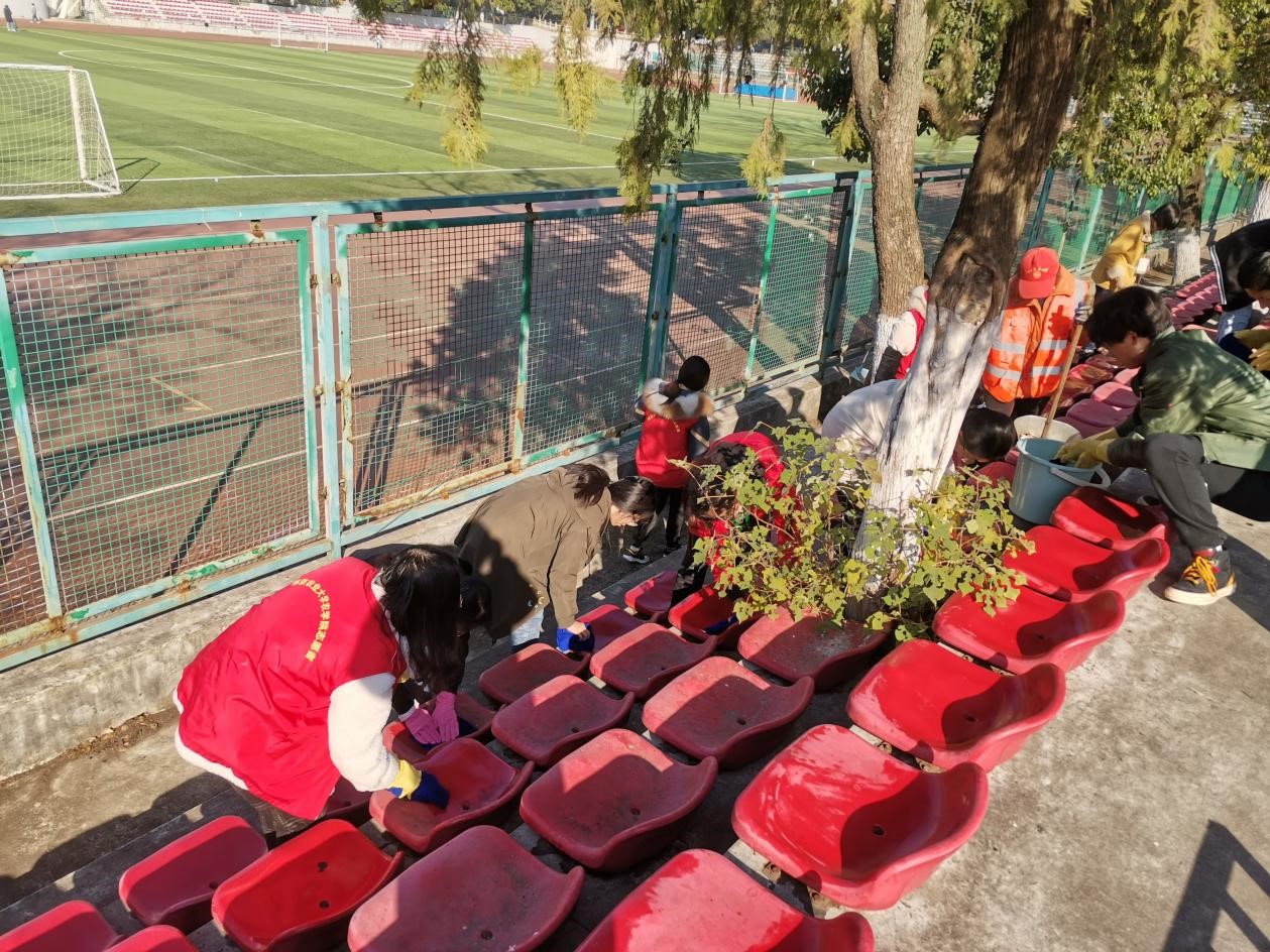 为了给大家营造一个干净整洁,舒适卫生的校园环境,在后勤部的协助下志愿者们对看台地面进行了清扫,对座椅进行了擦拭。特别是靠近宿舍楼处的看台座椅因久未打扫,不仅地上有很多树叶垃圾,座椅上更是有难以清理的尘垢。志愿者们细致认真,在相互帮助下完成了清理工作。