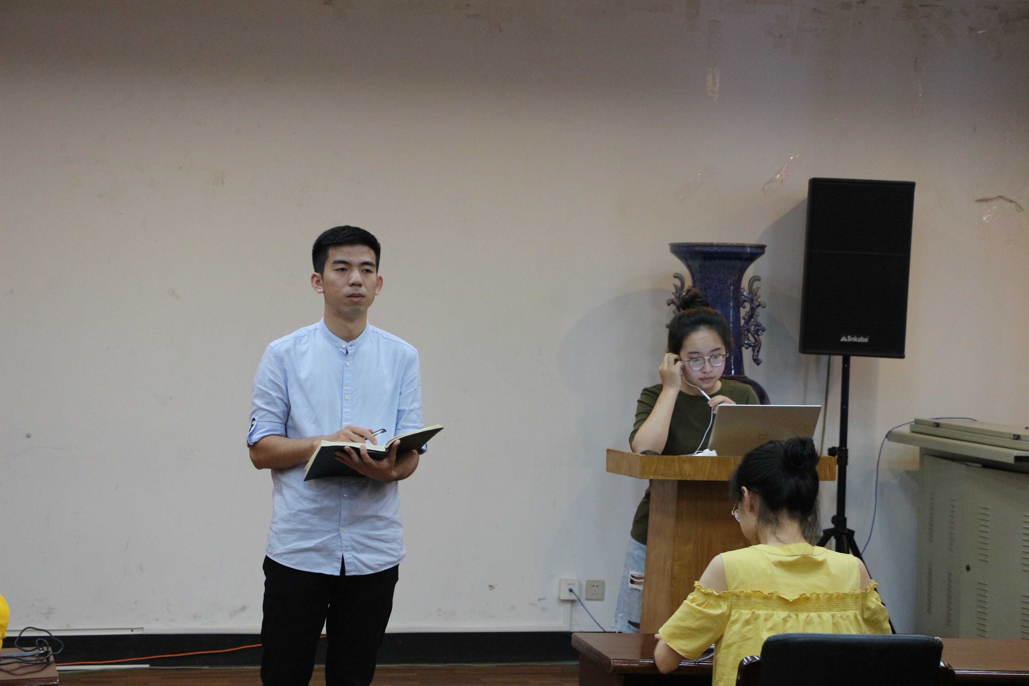 确认所有人员到齐之后,叶彤首先讲解了此次迎新活动的主要流程。内容主要分为新生到校前和到校后两部分。新生到校前,志愿者要通过短信或其他多种方式联系新生,并解答其存在的问题,然后进行到校时间、行李数量、随行人员等信息的确认。新生到校以后,志愿者要提前签到并领取志愿者证,待新生到校之后帮助新生完成报到手续、引导新生拍摄入学第一照、帮助新生搬运行李并带至宿舍确认安顿完毕,最后回番号鸽 帐篷签退,并归还志愿者证。