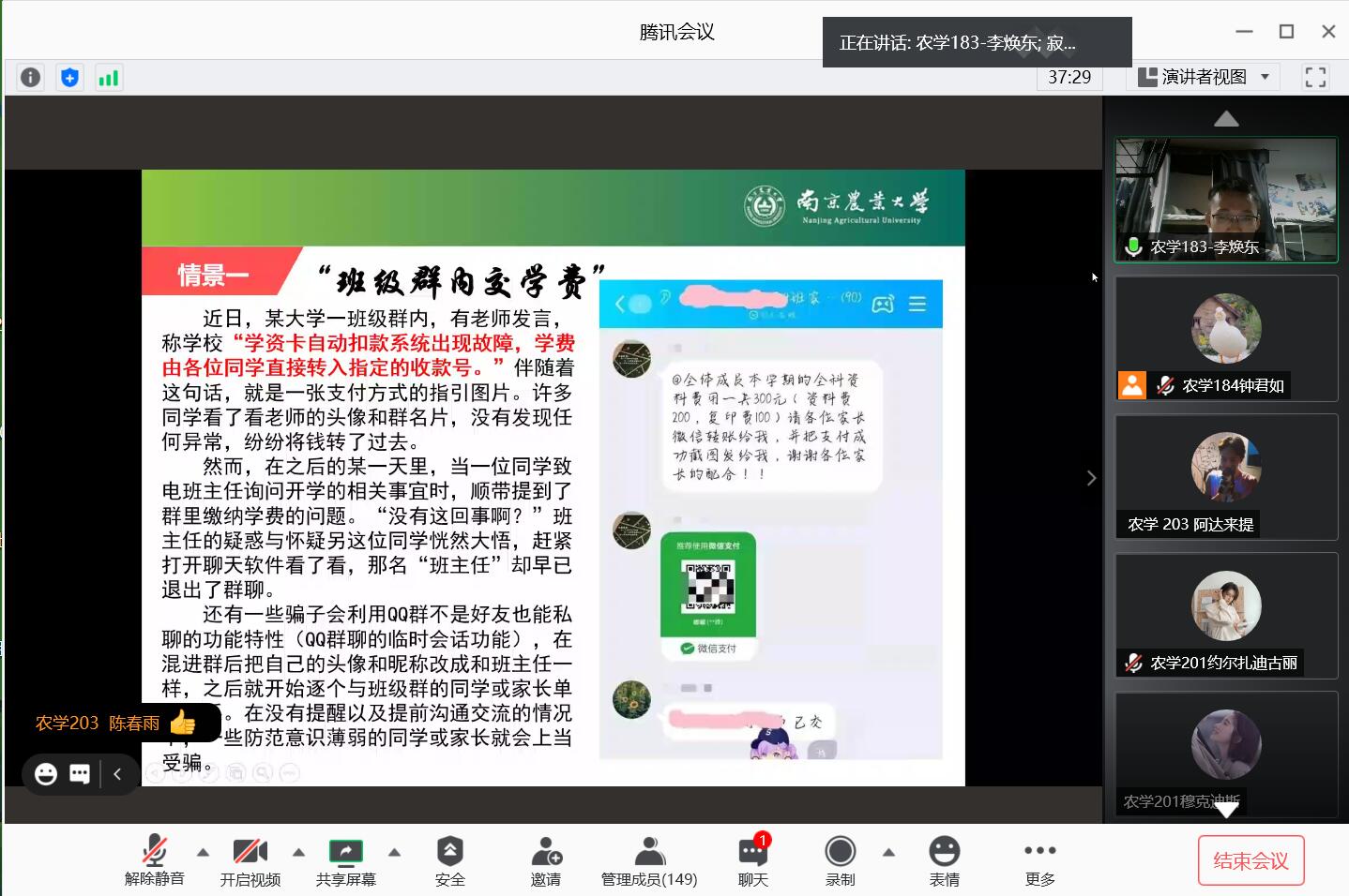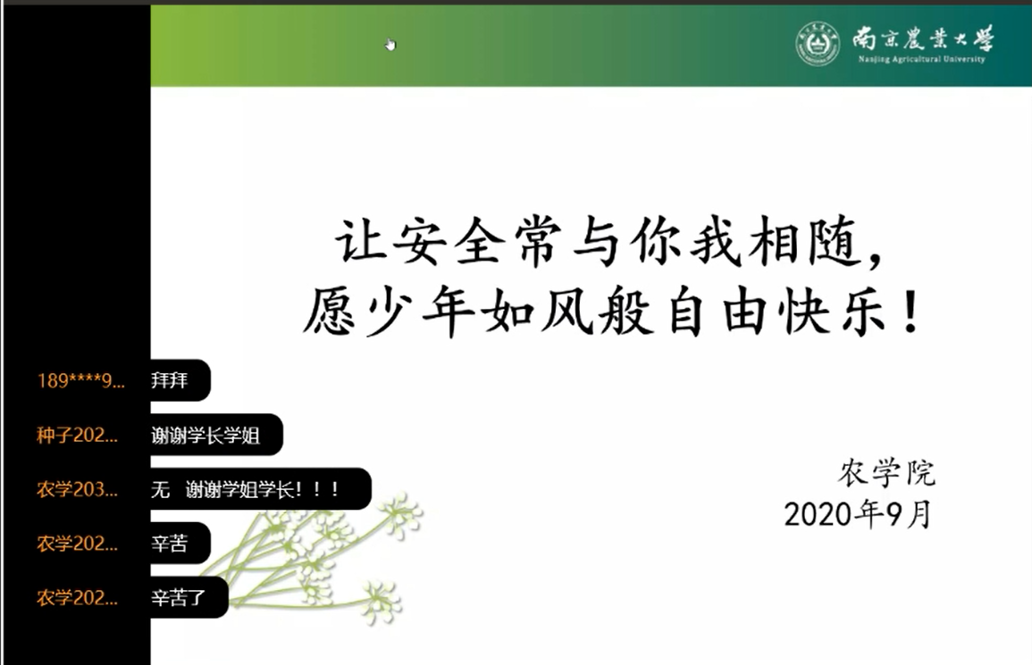9月17日上午,番号鸽 2020级新生因军训遇雨,在宿舍通过线上视频会议的方式上了一堂妙趣横生的安全教育课。课程由农学203班团务助理李焕东主讲,番号鸽 学生团委副书记钟君如主持。