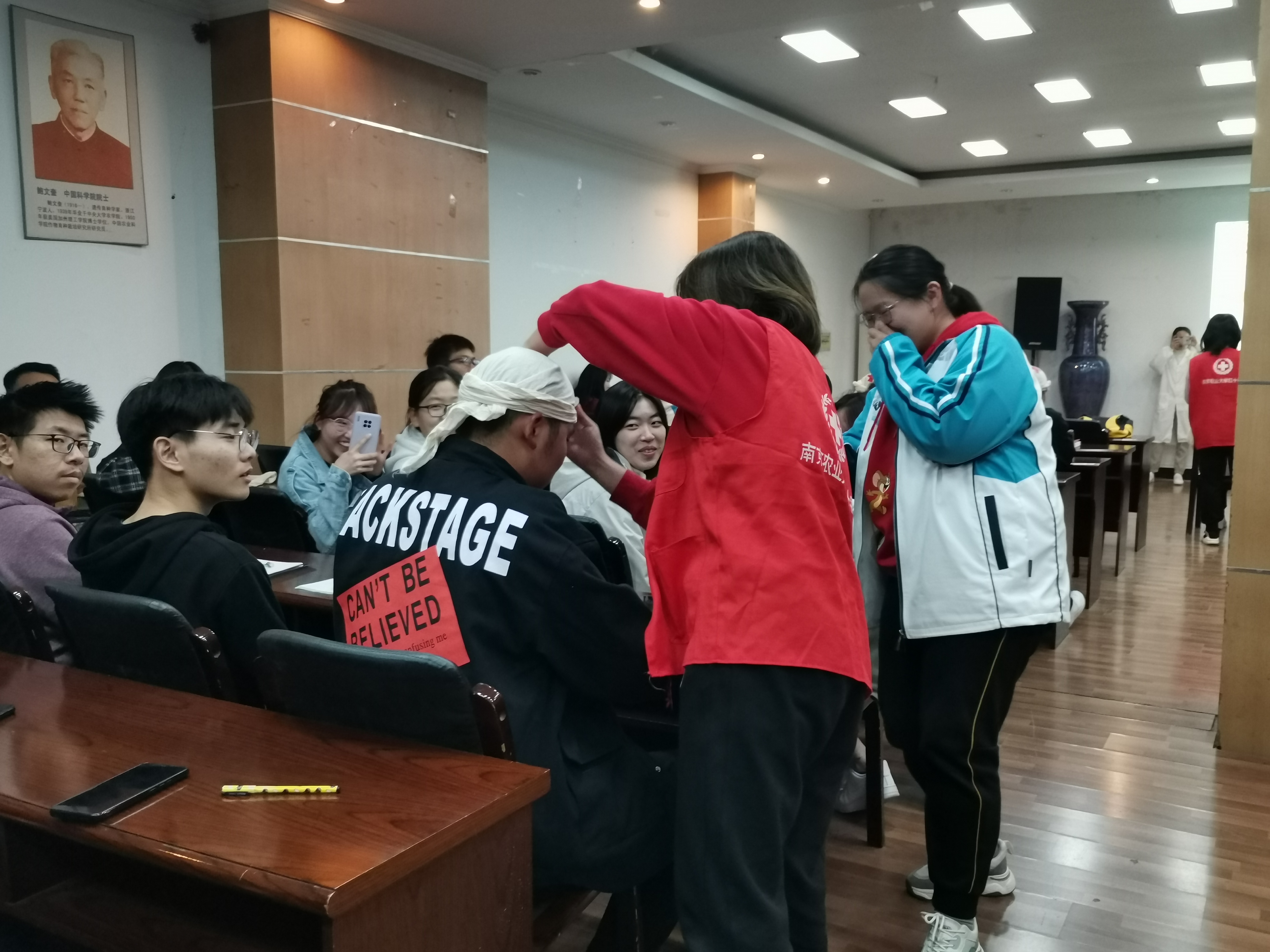 随后,工作人员现场展示了紧急包扎的基本操作。台下的同学们积极动手实践,展现出了高度的学习热情。在实践过程中,工作人员还为台下许多同学提供了具体包扎方式的现场指导。