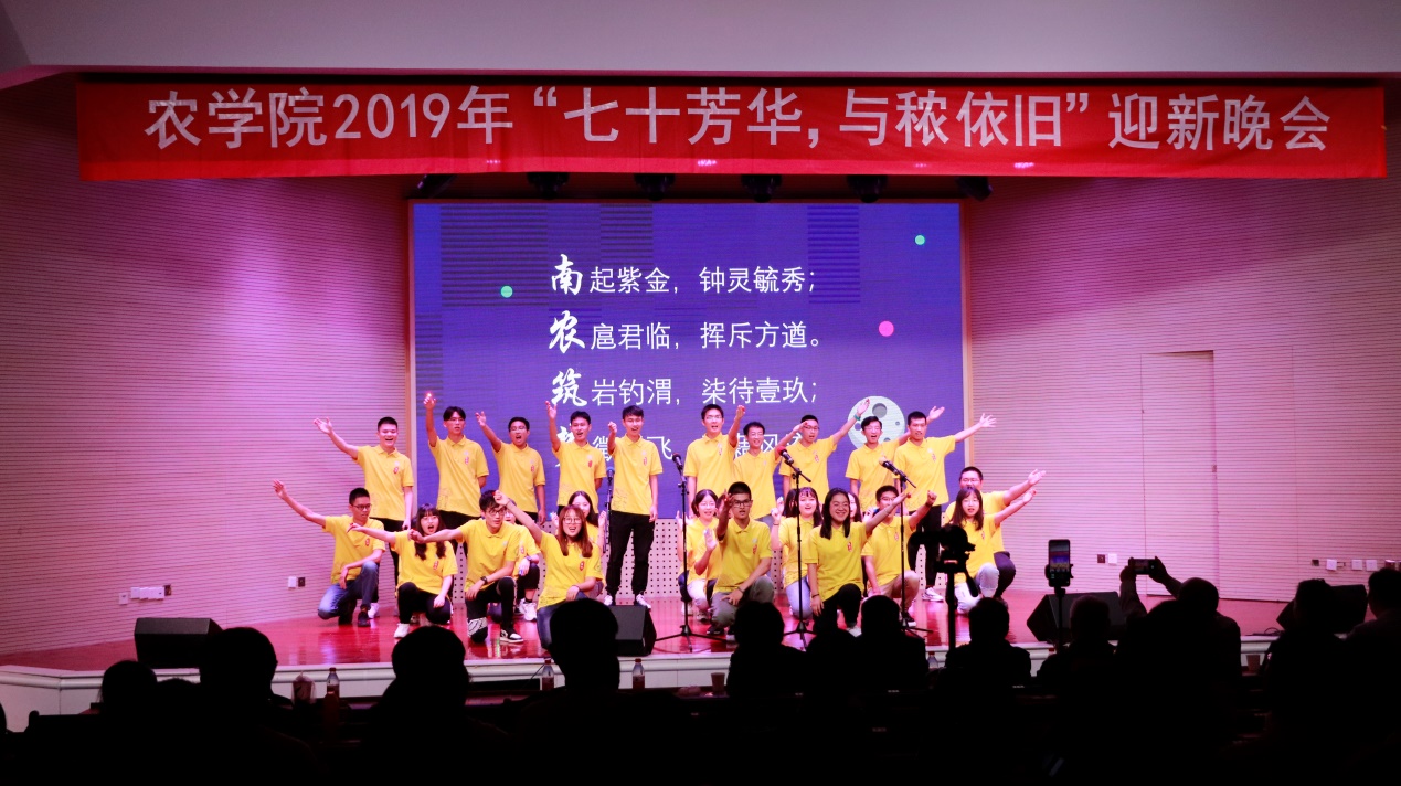 晚会节目由“芳华与农”和“七十同行”两个部分组成。在第一部分中,九个新生班级带来了合唱、舞蹈、乐器演奏、舞台剧等节目。第二部分,是由七个班级通过朗诵、歌舞、话剧等形式,分别展现了五零至零零年代以及未来各个时代的印记。