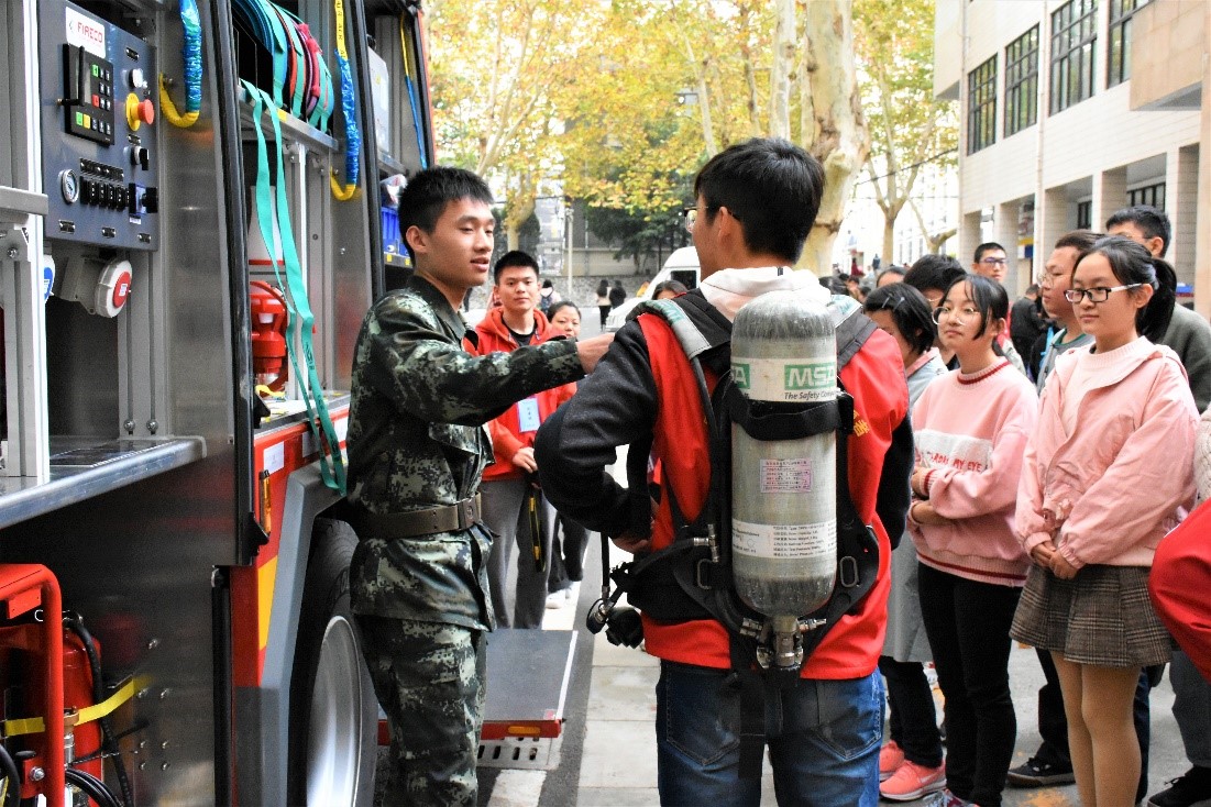 活动于下午4时开展,首先消防员于玉兰路为新生讲解消防器材,增加同学们对消防车、消防软管、水枪喷头、消防服等消防器具的了解。