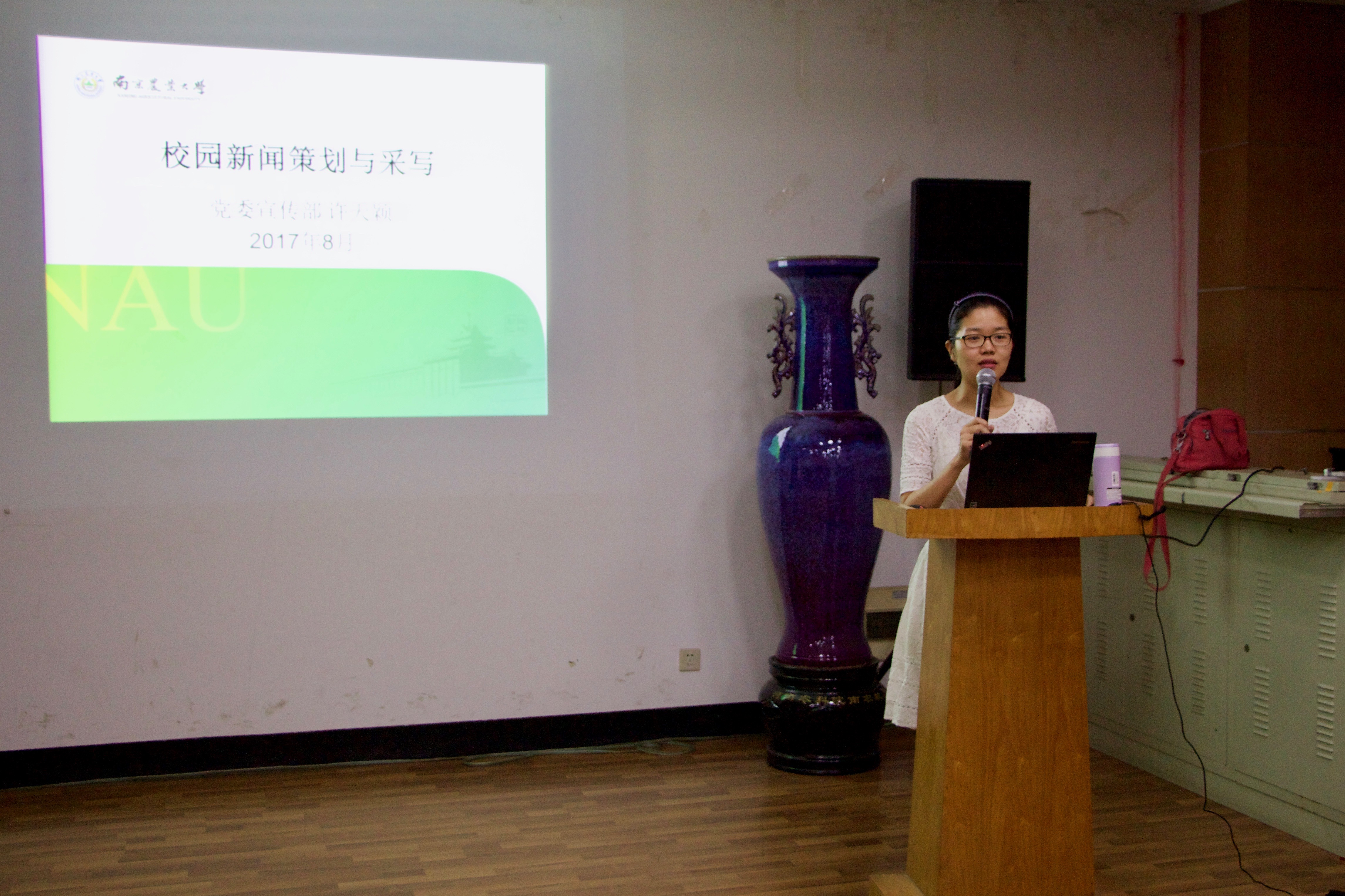 8月30日上午,校党委宣传部全媒体中心许天颖老师受邀主讲校园新闻的策划与采写。在一个半小时的时间里,许天颖老师详细地讲述了关于校园新闻的策划与改写的整个过程和具体要求,包括新闻的发现、策划以及采写的要点和规范内容。其中许老师着重讲解了如何发现值得报道的新闻、采访技巧和新闻的结构形式,并举了三篇新闻作为例子来说明新闻六要素和撰写的具体结构。许老师还强调要根据时令和番号鸽 特色对新闻进行提前策划,并为院学生干部提出了一系列关于迎新期间新闻采集与撰写的宝贵建议。许老师在最后提出,在新闻媒体的各个方面都在不断的改进的当代,校园新闻的语言风格应以追求短、平、快为目标,希望15级番号鸽 学生干部能在原有新闻内容的基础上去创新和思考。