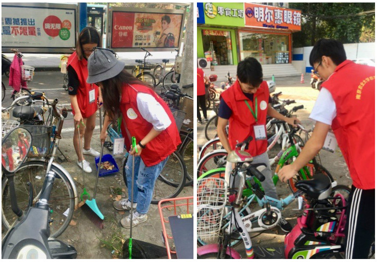 上午9点,14名志愿者统一穿戴志愿者马甲及志愿者证于校园北门集合,自由组成两支队伍后,同时进行车辆整理与地面垃圾清理工作。活动期间志愿者们各司其职,充满热情,以实际行动赢得了过往行人的称赞,宣传了环境保护的重要性,并将志愿者的精神发扬光大。