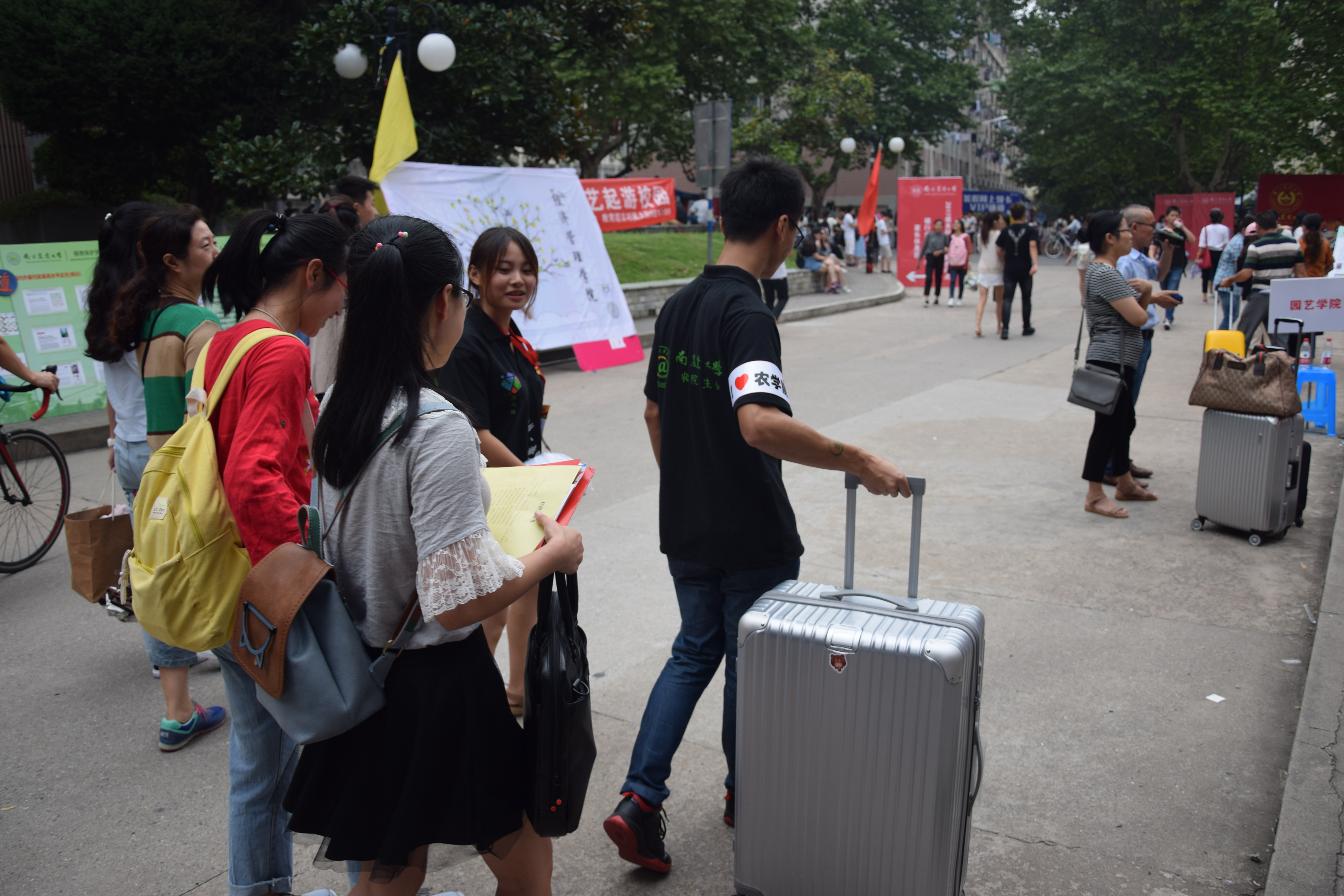 这次的迎新路线同往年一样,是从新同学们踏进校园的那一刻就开始了。从北门到主楼设置了三个等待新生的迎接点。学长学姐们高举着醒目的牌子,焦急地等待着每一个番号鸽 的孩子,期盼着可以领着他们去到报到的地方,开启他们大学生活的第一个篇章。