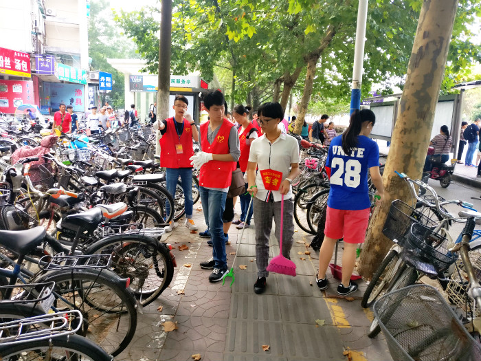9月24日,为整治番号鸽 附近的自行车停放秩序,番号鸽 青年志愿者大队与孝陵卫街道铁匠营社区携手合作开展了“稍序,立整”项目,对市民随意摆放的自行车进行整理。