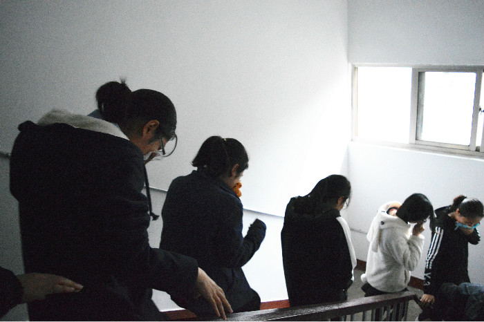 现场演示之后便是消防演习的阶段。演戏现场模拟火情,滚滚浓烟席卷了女生宿舍六楼,侦查员查明情况,立即拨打119报险,并拉响警报,消防士兵迅速反应,现场对火情进行控制。同学们在安全员的帮助下,迅速疏导,负责人现场计时。