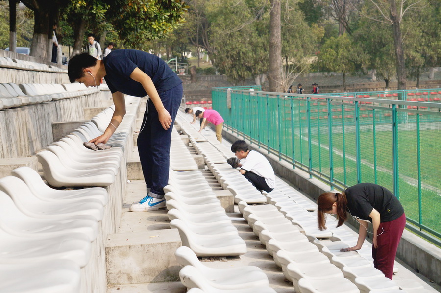 分工明确后,清扫正式开始。大家井然有序的走到各自负责的区域,对每个座椅,每处角落都进行了地毯式的扫描。阳光甚好,合理的分工,高效的运作,让清扫工作进行的相当顺利。转眼间,看台上,座椅上都变得焕然一新。封闭的外衣遮挡不住大家背上浸出的汗水,尽管辛苦,却掩盖不了同学们愉悦的心情。
