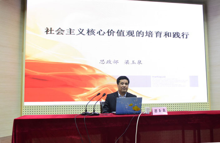 梁玉泉老师从什么是价值入手,对价值做了简单定义,接着从马克思主义的科学性等四个方面阐述了中国为什么选择社会主义核心价值观。随后,梁老师围绕“富强、民主、文明、和谐,自由、平等、公正、法治,爱国、敬业、诚信、友善”24字,分层次、渐进地阐述了社会主义核心价值观的内涵。