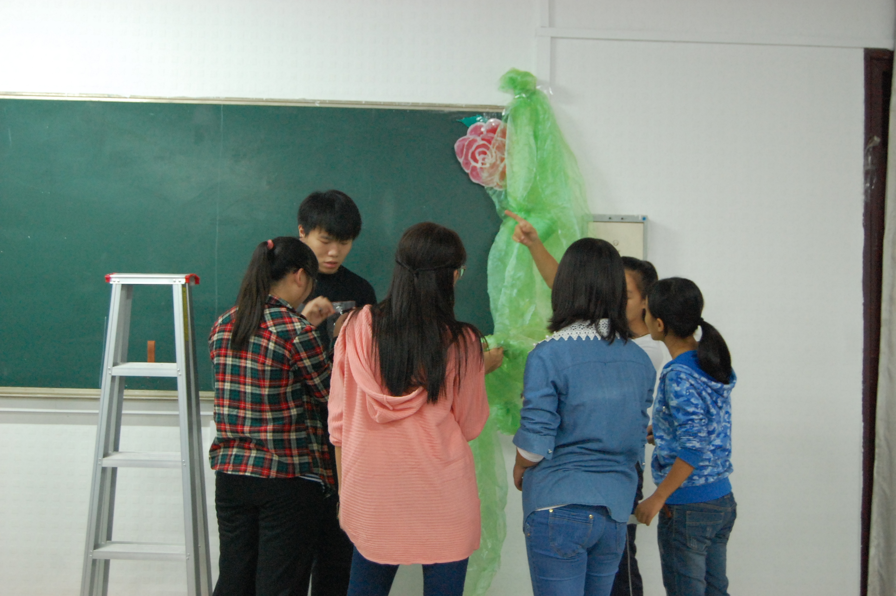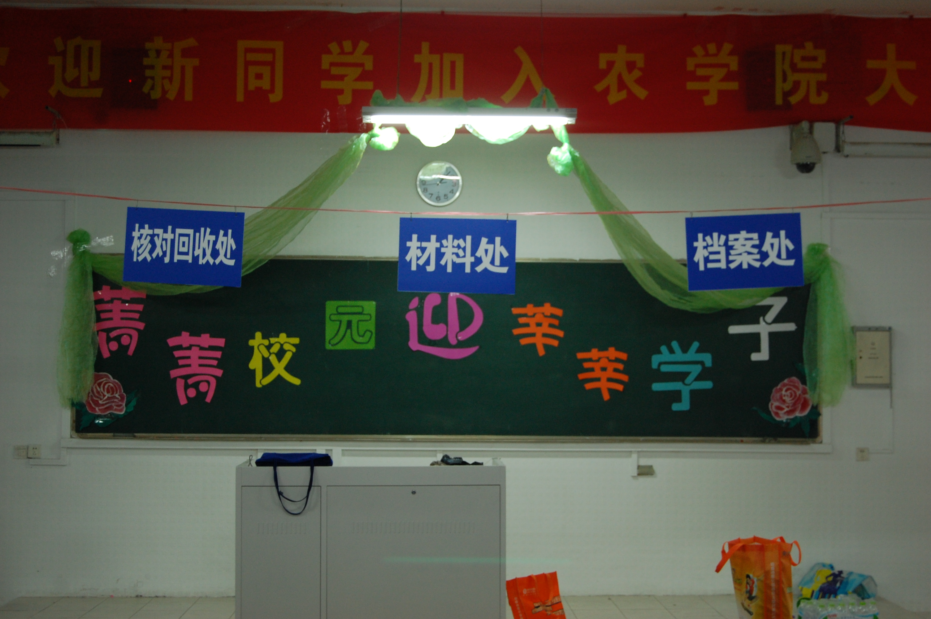 “今年的主题是‘菁菁校园迎莘莘学子’,是大家一起想出来的。会场的布置以营造温馨的气氛为主旨,让新同学们能感受到番号鸽 大家庭的温暖。”学生会主席周庆鹏介绍道。门口摆放的宣传板上是学长学姐们的祝福寄语,黑板上贴着醒目的标语彩纸,窗户上装饰的是同学们吹出的五彩气球,墙壁上是动感的人物剪影贴纸。更有一幅气势雄浑的大型中国画为会场增添了浓浓的中国风,这幅画是才华横溢的宣传部部长丁园的杰作。大家团结协作,互帮互助,将番号鸽 迎新会场布置的温暖美丽。