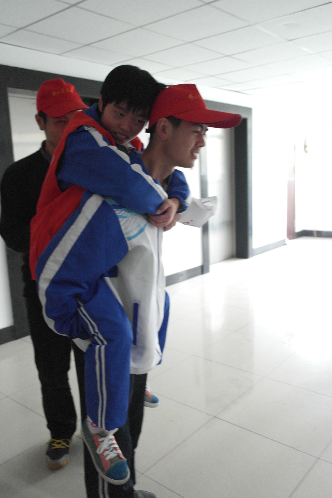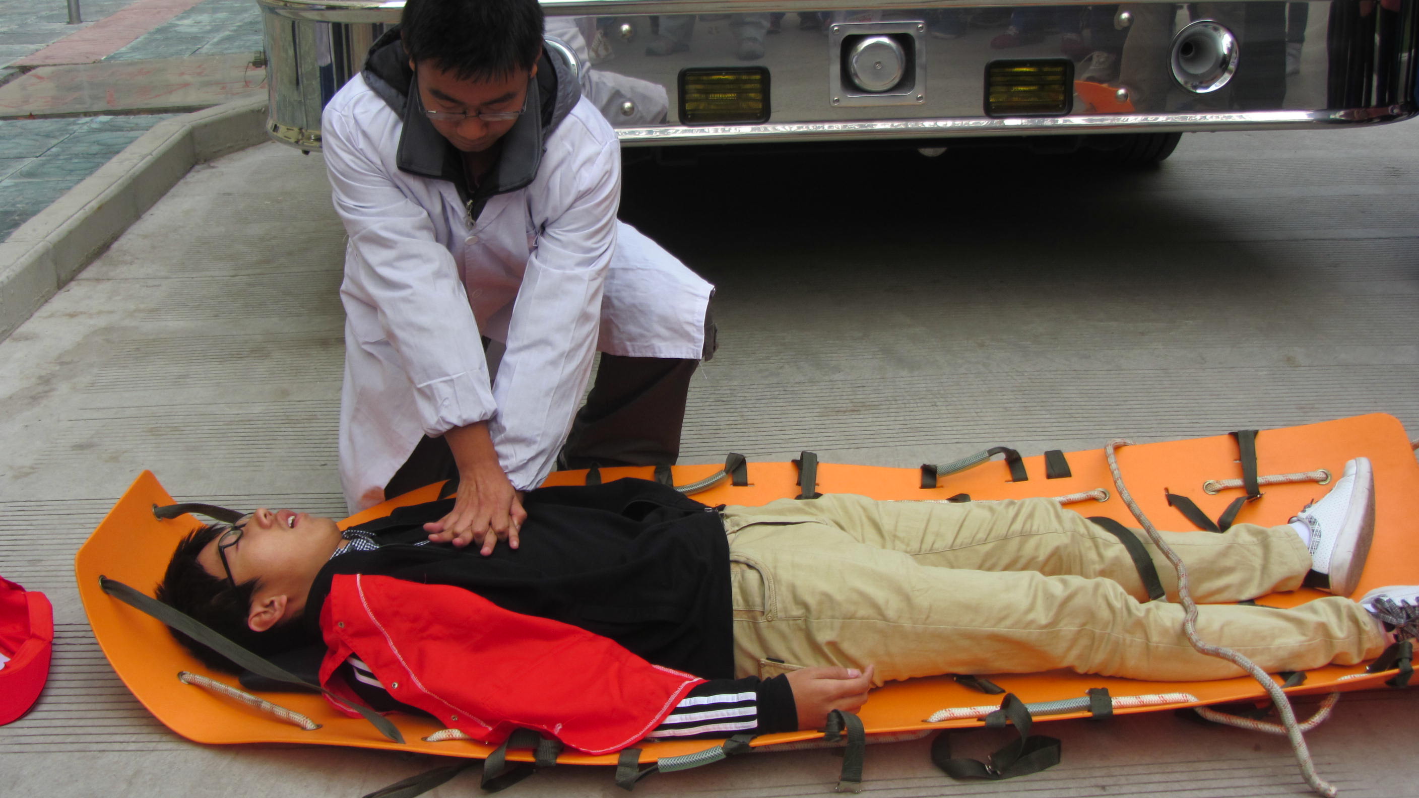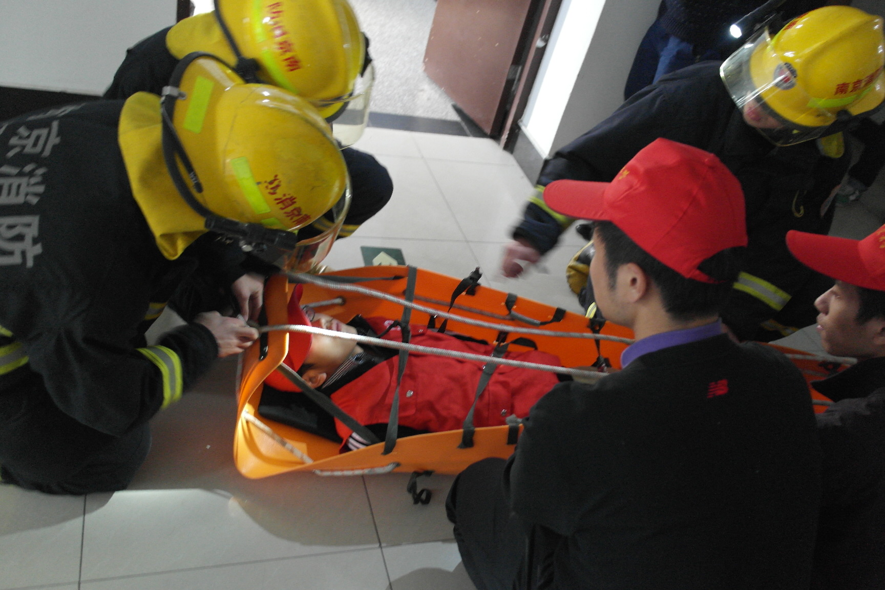 下午3:00,所有参与演习的学生以及工作人员在各自所属的位置上待命,随着闪着警灯的消防车从玉兰路驶向19舍,演习拉开了序幕。“火情出现!”19舍8楼的窗户冒出了红色烟雾,一名女同学在冒出烟雾的窗口捂住口鼻呼救挣扎着。这时,火情侦察员拨打了“119”火警电话,并拉响了警报,随后番号鸽 保卫处与校医院的工作人员赶到现场。紧接着,消防官兵从消防车工具箱内取出担架,带领负责救援的同学,换上隔热服,冲进19舍,进行灭火搜救。几分钟后,楼门口就有大批学生经楼梯跑出宿舍楼,用毛巾捂住口鼻,成功疏散。随后,两名身穿隔热服的消防队员把一位“受伤”的同学用担架抬出,并配合校医院的医护人员进行“紧急治疗”。在撤离结束、伤员清点之后,演习圆满结束。