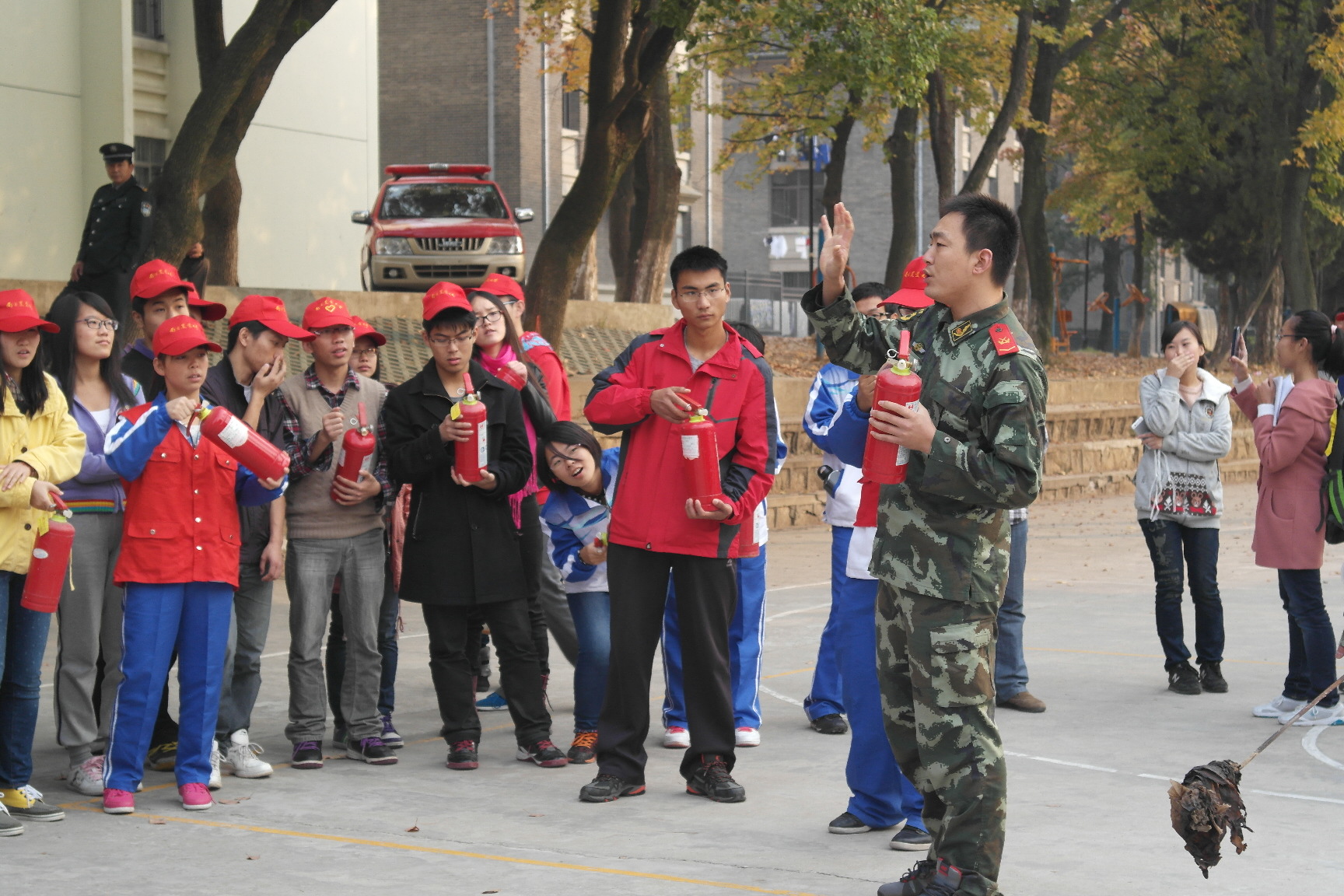 活动结束后,消防队员对此次演习进行了讲解与点评,并指导在场学生使用灭火器。校医务人员与番号鸽 红十字会成员也对同学们讲解了急救知识和伤病紧急处理方法。随后同消防官兵的联谊篮球赛同样精彩,气氛热烈,同学们的欢呼声此起彼伏,为此次消防演习活动划下了完美句号。